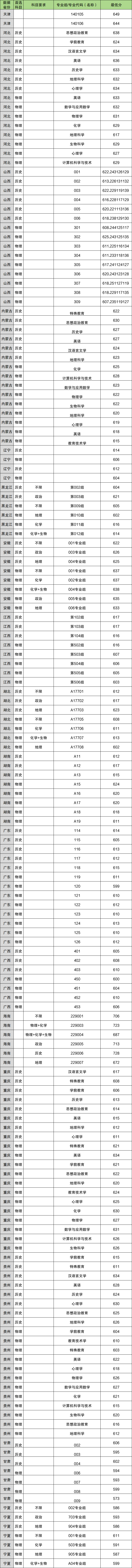下面为2025年西南大学公费师范生录取分数线全国各省汇总表,各位同学可查阅自己所在省份数据: