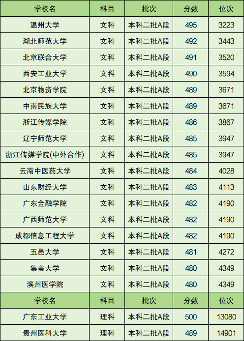 2023年在该省文科录取线位于480分到500分之间的公立二本院校有17所,其中比较好的有495分的温州大学、492分的湖北师范大学、491分的北京联合大学、490分的西安工业大学等。理科录取线位于480分到500分之间的公立二本院校有2所,包含了广东工业大学、贵州医科大学。
