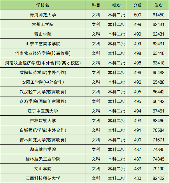文科有500分的青海师范大学、499分的常州工学院、499分的泰山学院、499分的山东工艺美术学院、498分的河南牧业经济学院(较高收费)等18所。根据河南文科2023年的录取情况来看,480分至500分之间收分最低的公办二本大学是江西科技师范大学,文科最低分为480分。