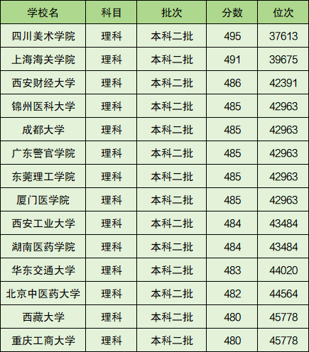 理科有495分的四川美术学院、491分的上海海关学院、486分的西安财经大学、485分的锦州医科大学。根据广西理科2023年的录取情况看,480到500分之间收分最低的二本公办大学是西藏大学、重庆工商大学,最低分为480分。