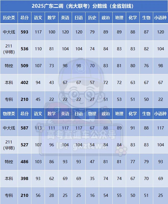 2026届广东二调即为2025年光大12月联考,考试时间为12月4日-5日,考后按照全省和地区分别进行划线。2026广东二调分数线如下(深圳投稿):