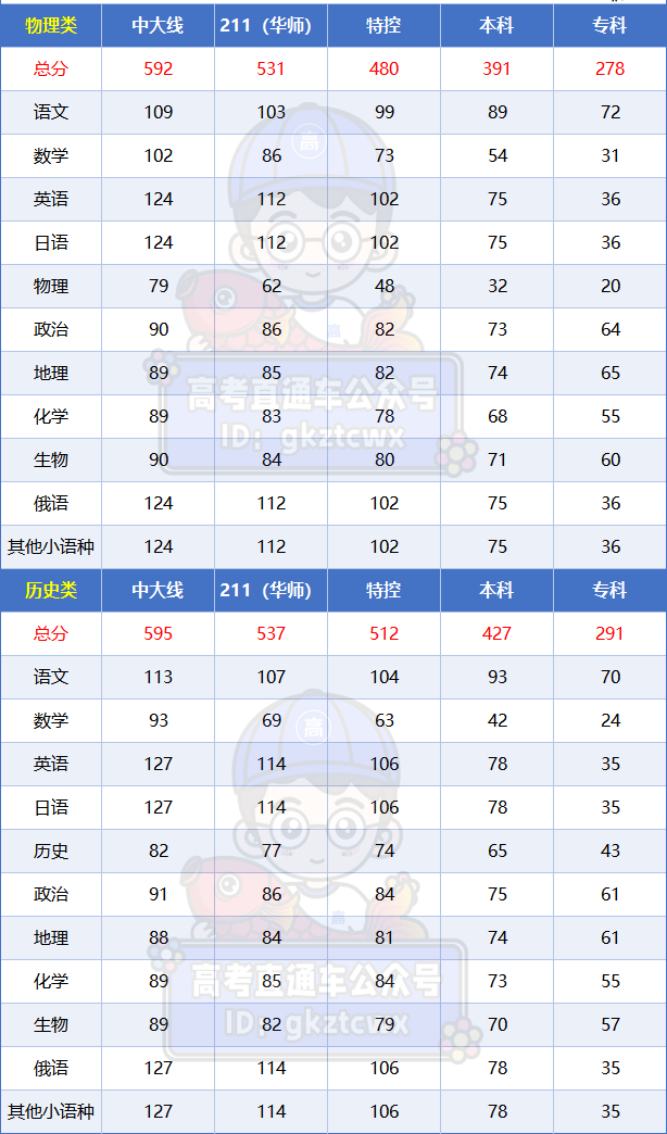 历史类:中大线595分、211(华师)线537分、特控线512分,本科线427分、专科线291分。