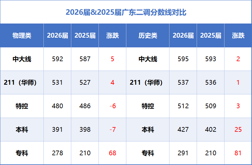 2026届与2025届相比,各分数线有不同的涨跌情况: