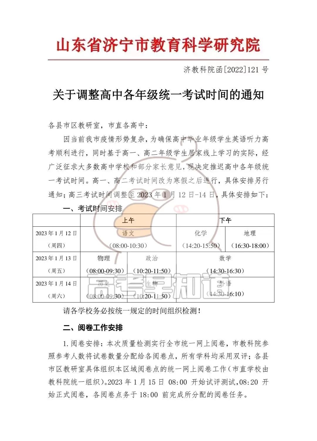 济宁市统一推迟高中各年级期末考试时间:高一高二考试时间调整到寒假之后进行;高三期末考试时间调整至2023年1月12日-14日。