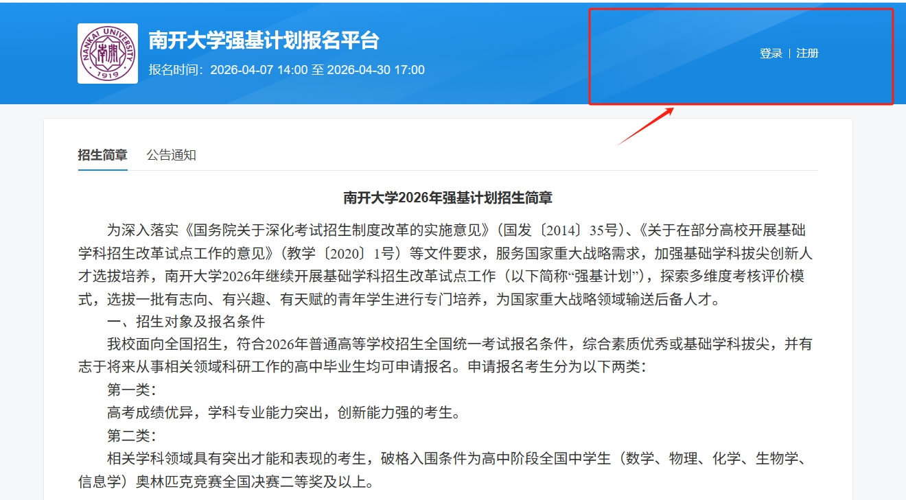 考生须登录南开大学强基计划报名平台进行网上报名: