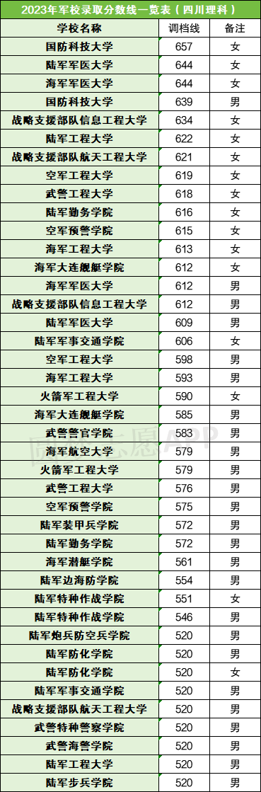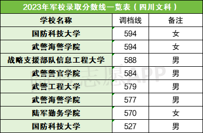 在2023年军校面向四川的招生中,在理科方面,军校的录取线在520-657分之间;在文科方面,军校的录取线在527-594分之间。关于各军校在四川详细的录取分数线,本文都进行了整理,供查阅。
