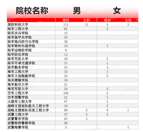 2024年在四川招生的军校有25所,包含国防科技大学、陆军军医大学、火箭军工程大学、战略支援部队信息工程大学、陆军装甲兵学院、陆军勤务学院、空军军医大学、武警工程大学。关于这些院校面向男生和女生具体招生的人数,详情如下: