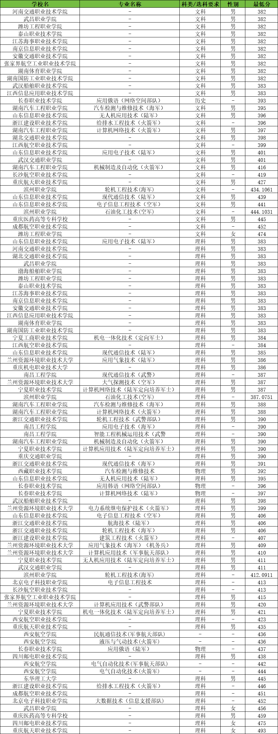 最高分493分对应的士官学校为重庆航天职业技术学院,性别要求为女生;