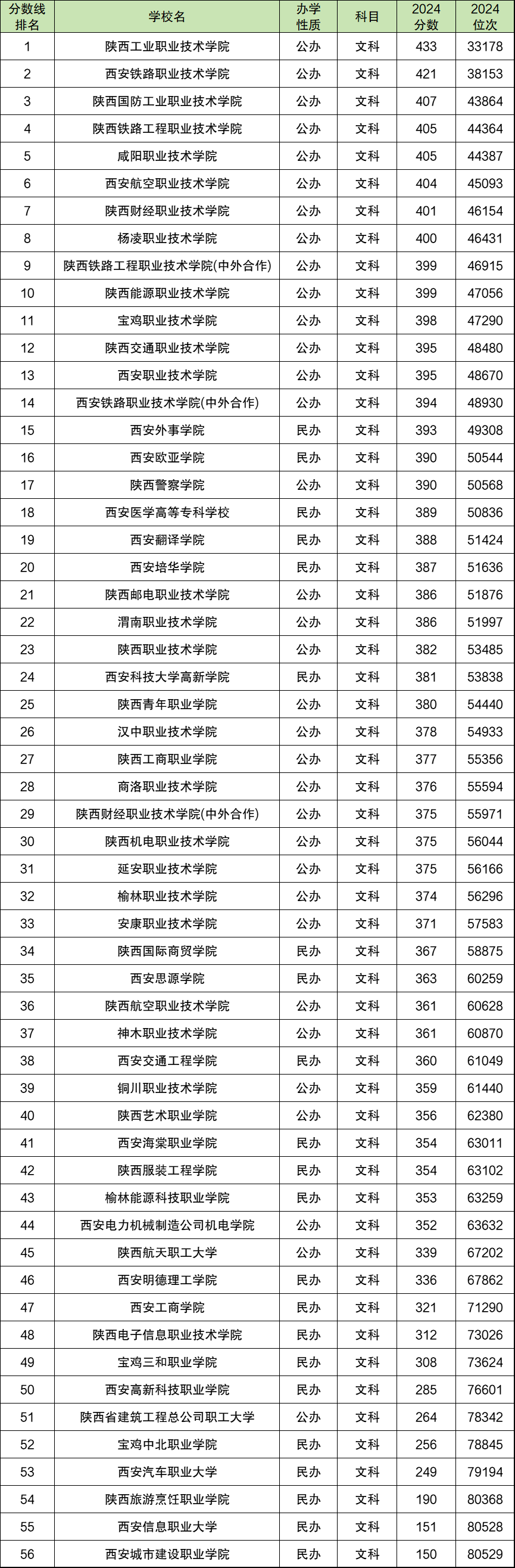 2024年陕西文科录取分数线最高、最难考的专科大学是:陕西工业职业技术学院,2024年分数线为433分;