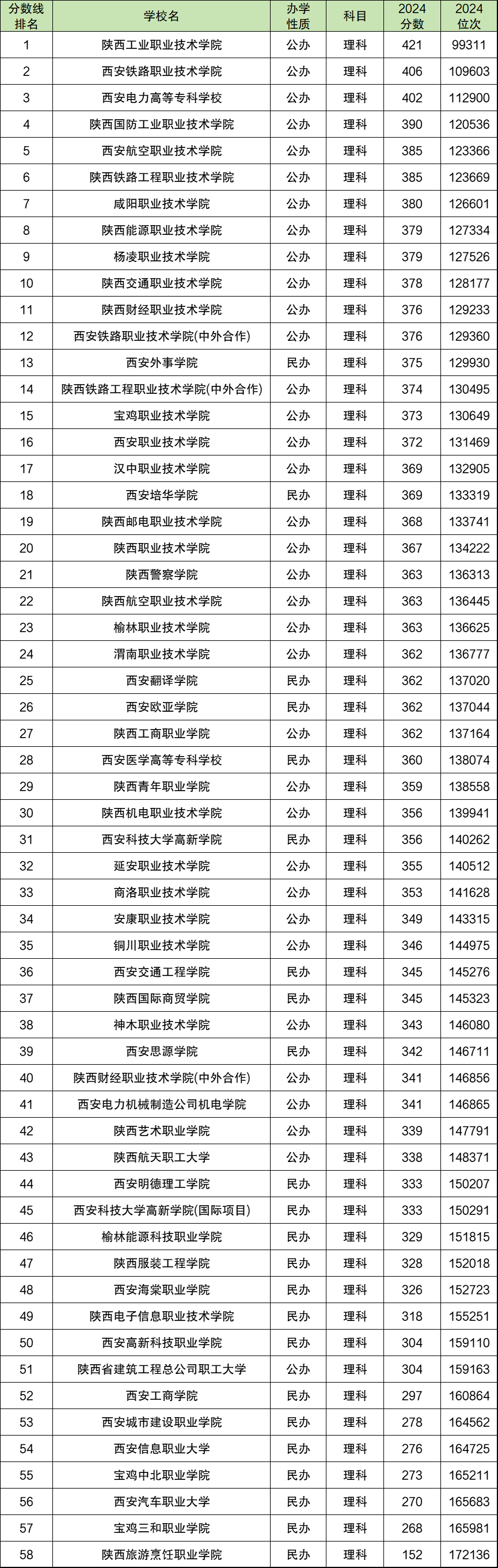 2024年陕西理科录取分数线最高、最难考的专科大学是:陕西工业职业技术学院,2024年分数线为421分;