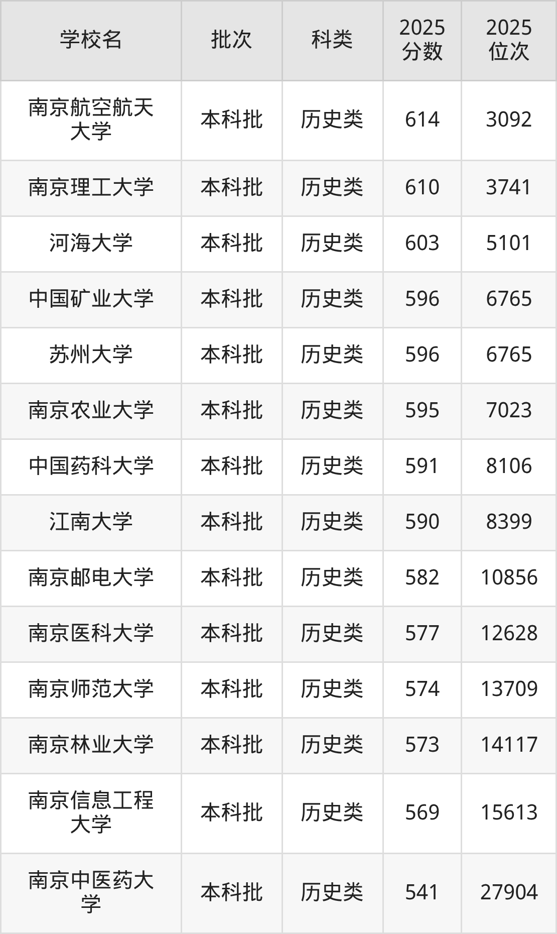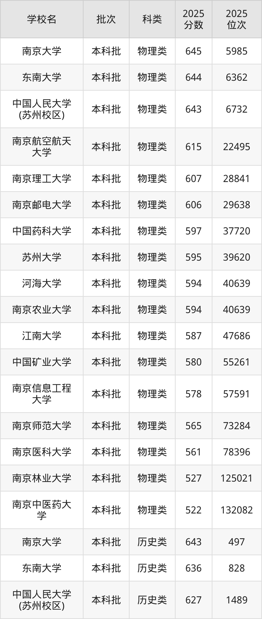 下面是2025年全国双一流大学在江苏的最低录取分数线一览表:
