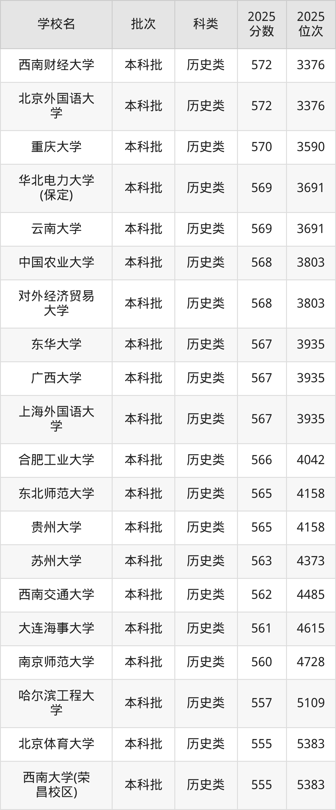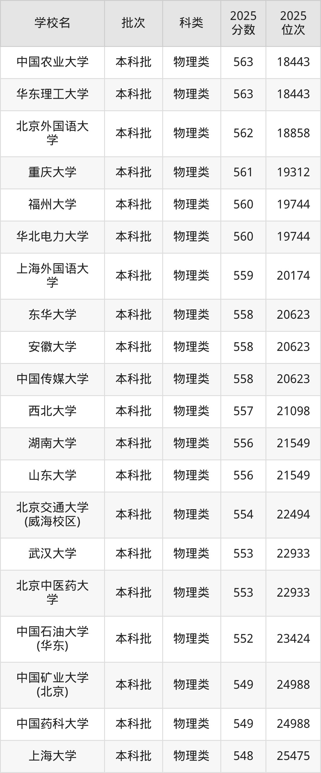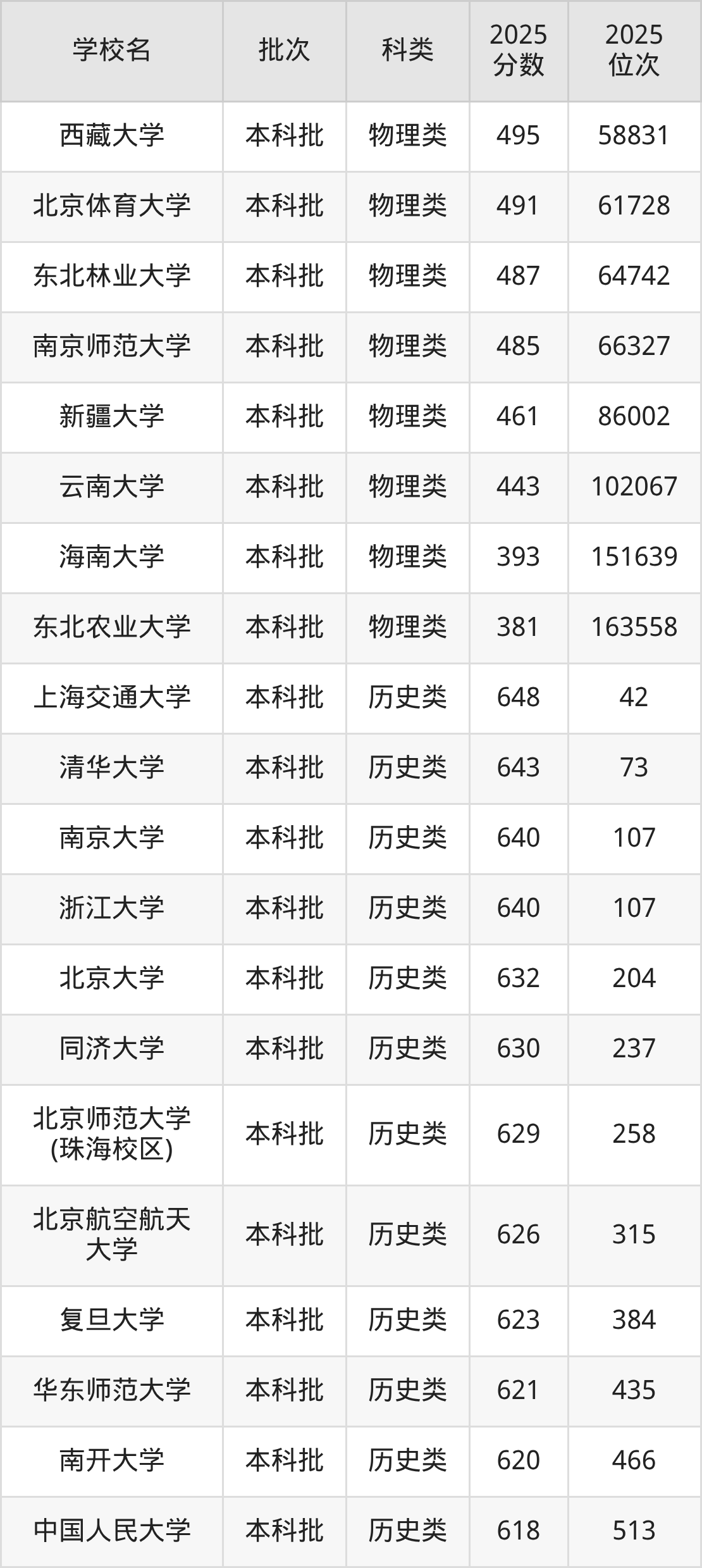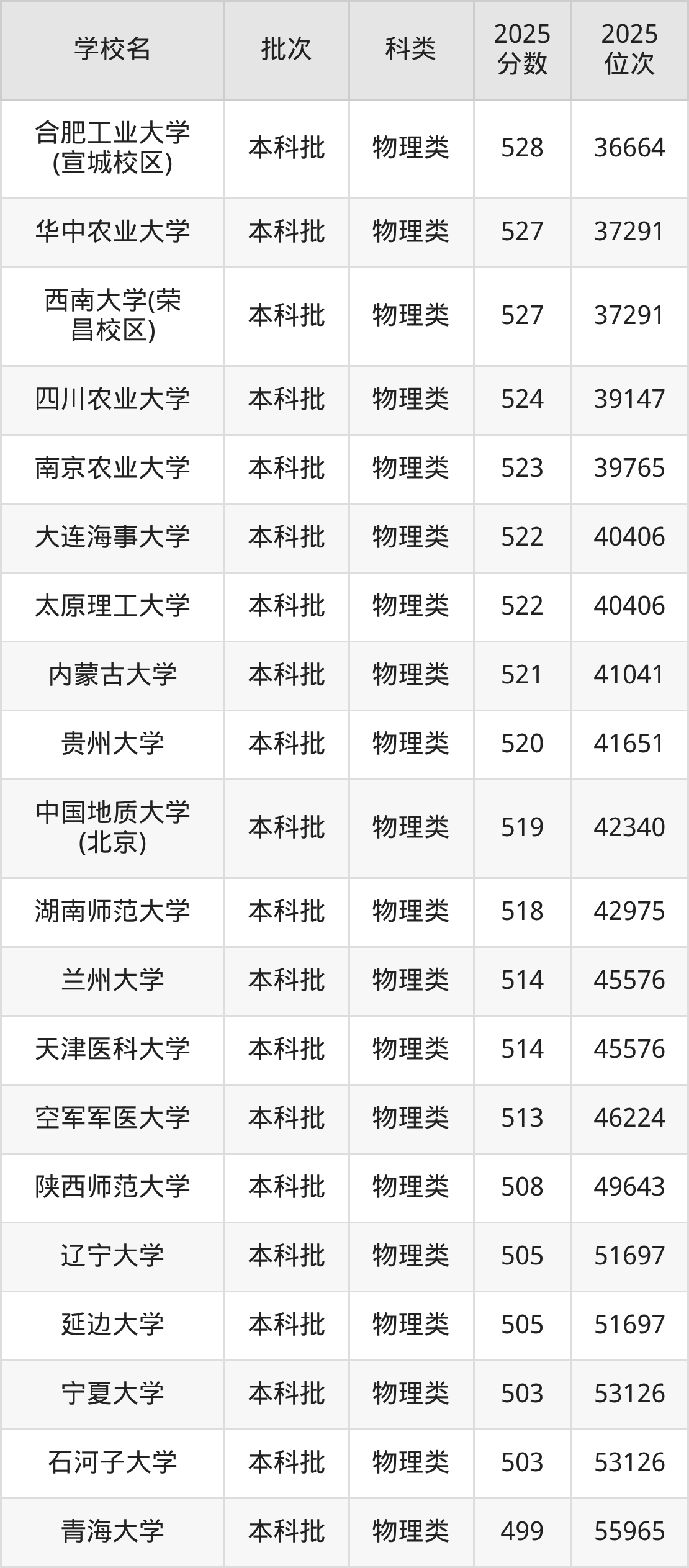 注:2025年广西物理类特控线495分。区内院校数量较少,以下数据取自全国所有211大学在广西的招生录取数据。