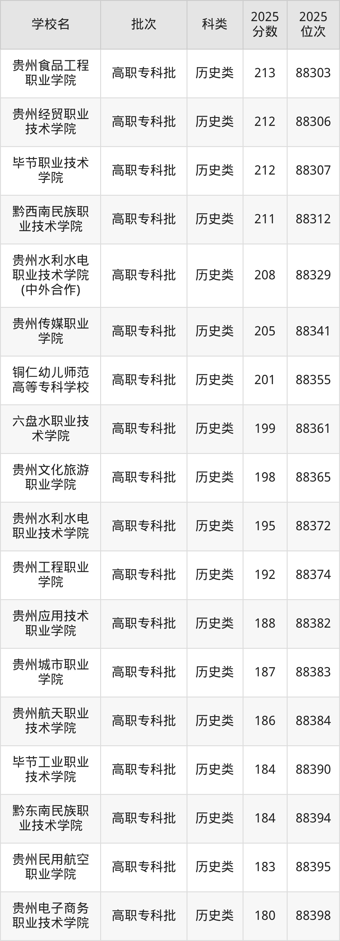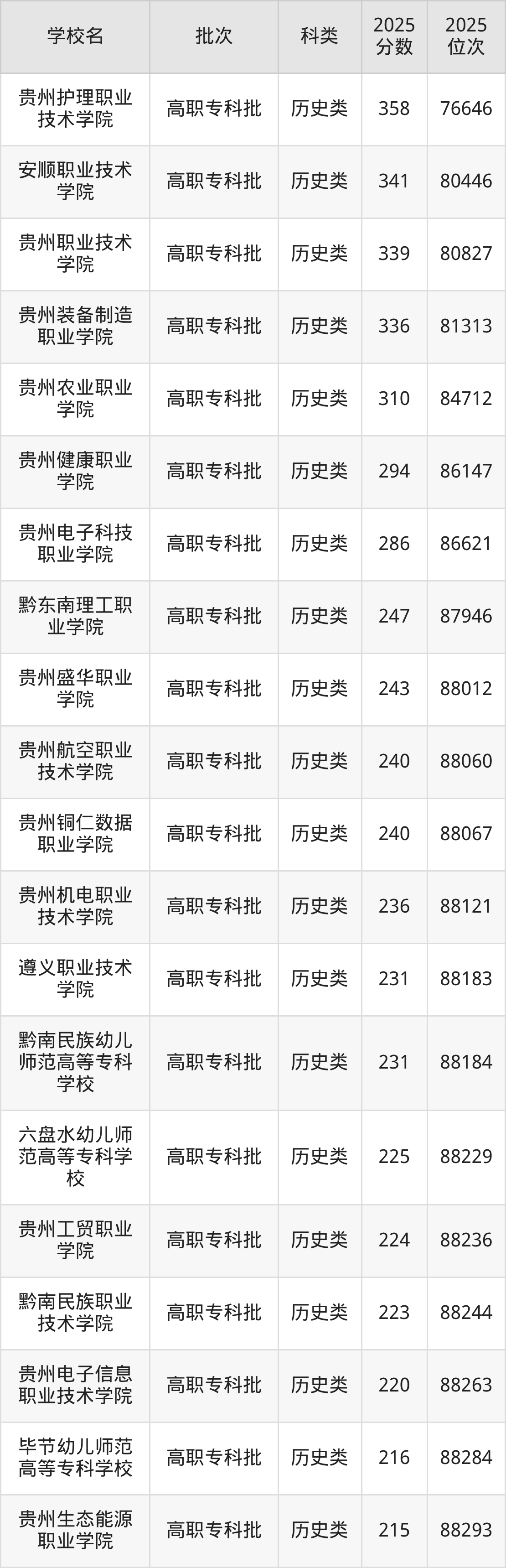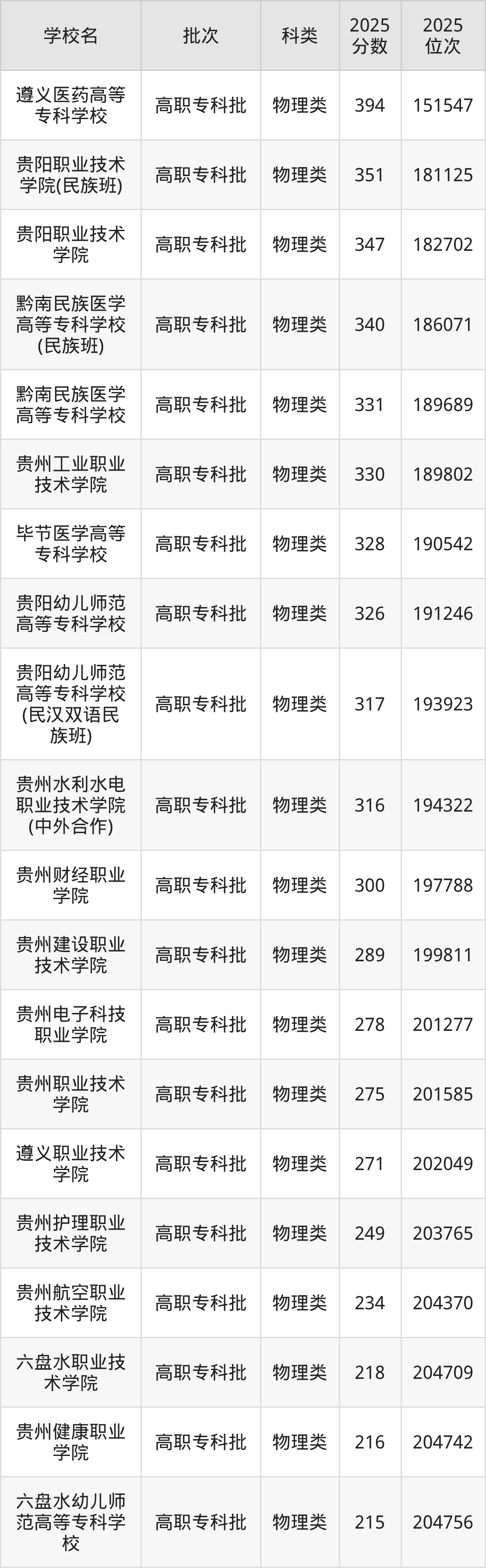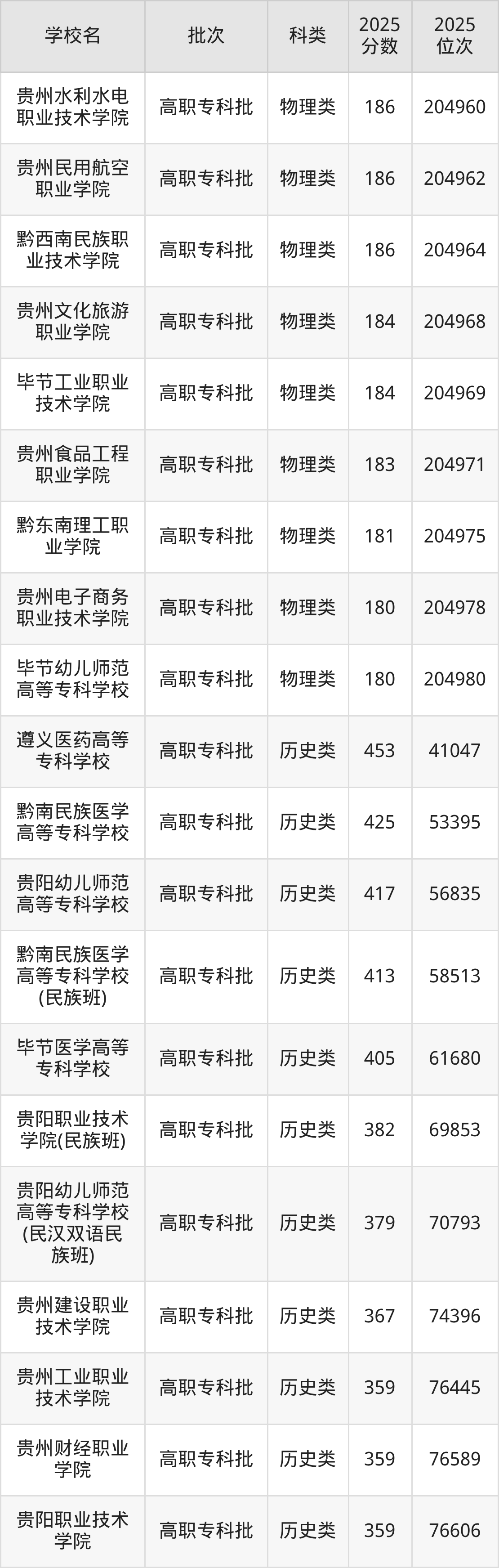 下面是2025年全国专科院校在贵州的最低录取分数线一览表: