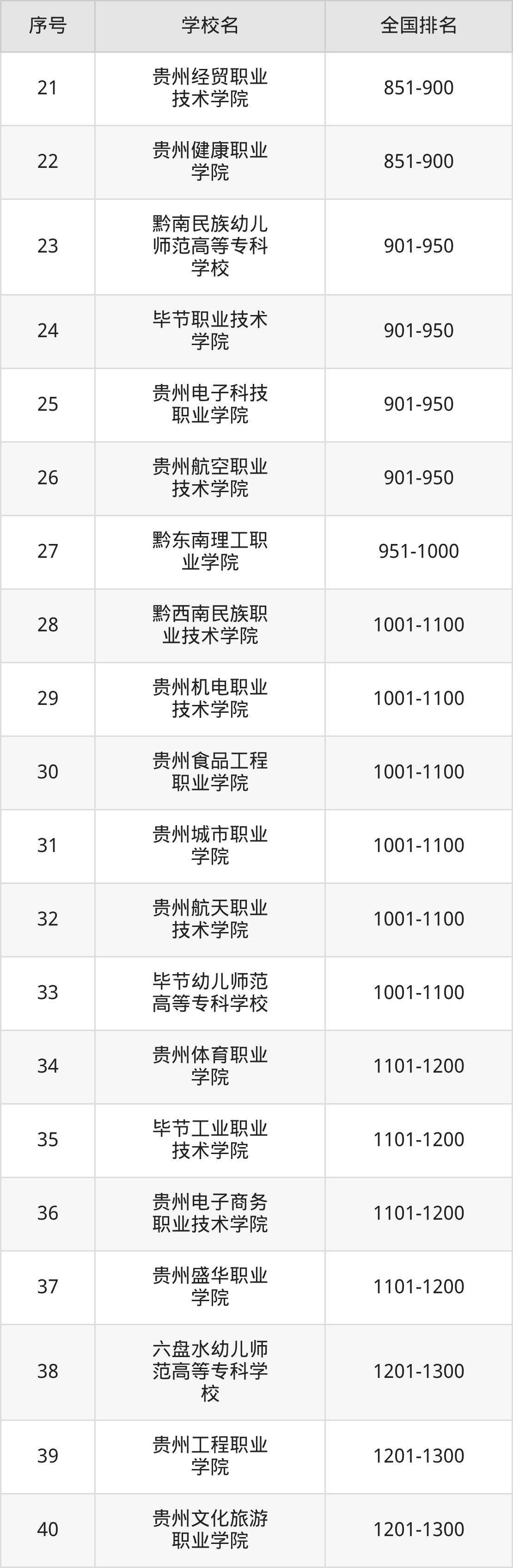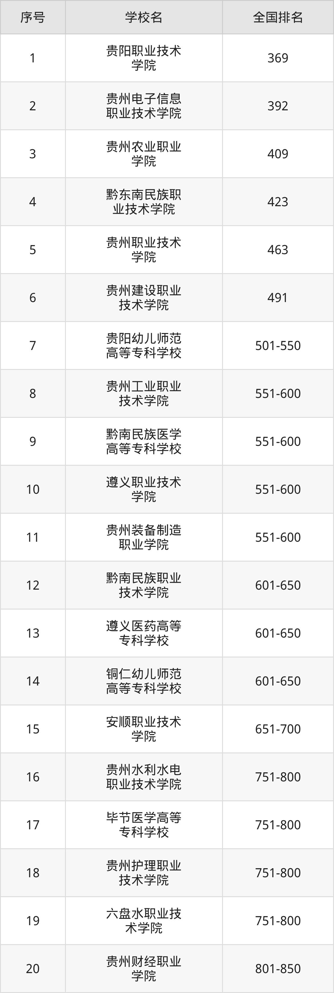 下面是贵州省专科院校最新排名一览表,供参考(部分院校未参与排名):