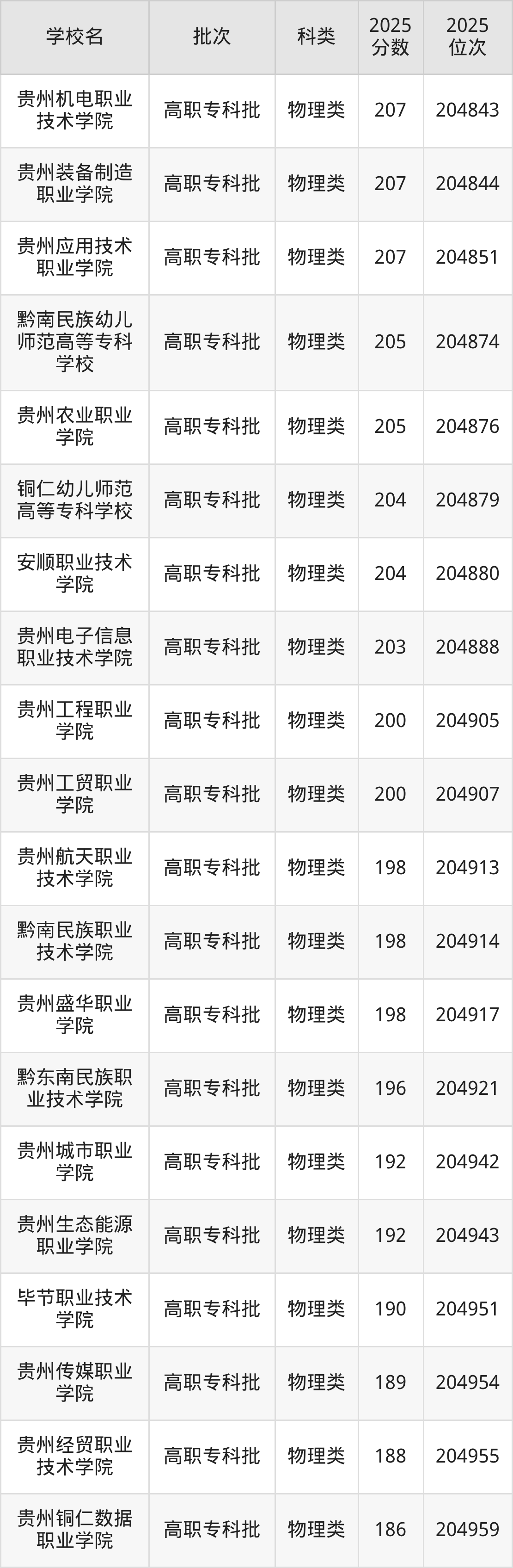 根据官方查询到的高职专科批物理类招录分数来看,2025年全国公办专科院校在贵州的最低录取分数为180分,最低分招生位次204978名-204980名。该分数招生的院校为贵州电子商务职业技术学院、毕节幼儿师范高等专科学校,适合低分考生报考。