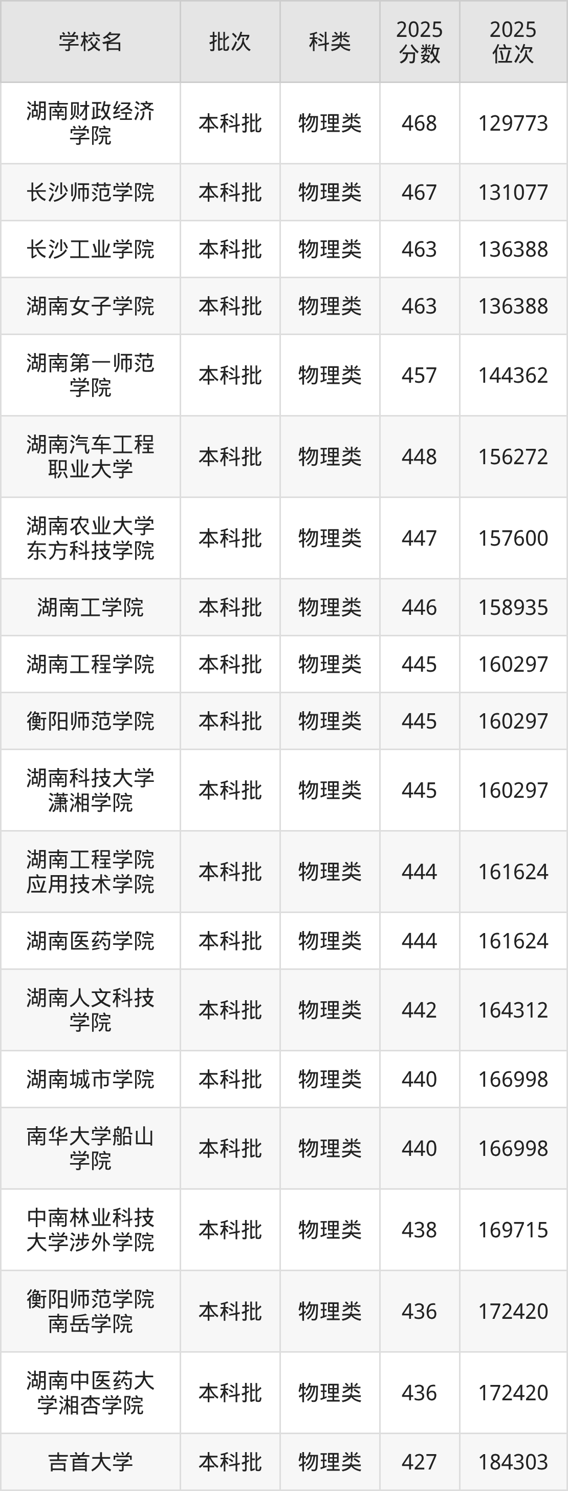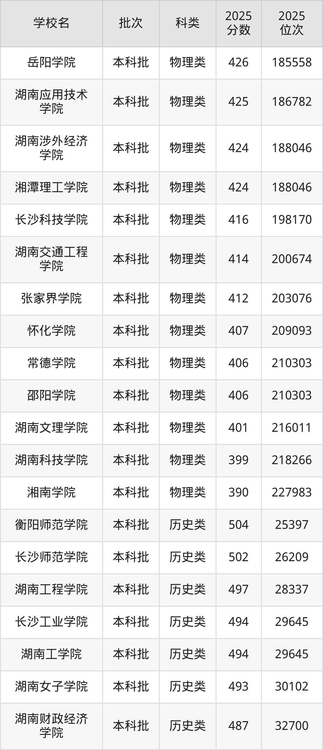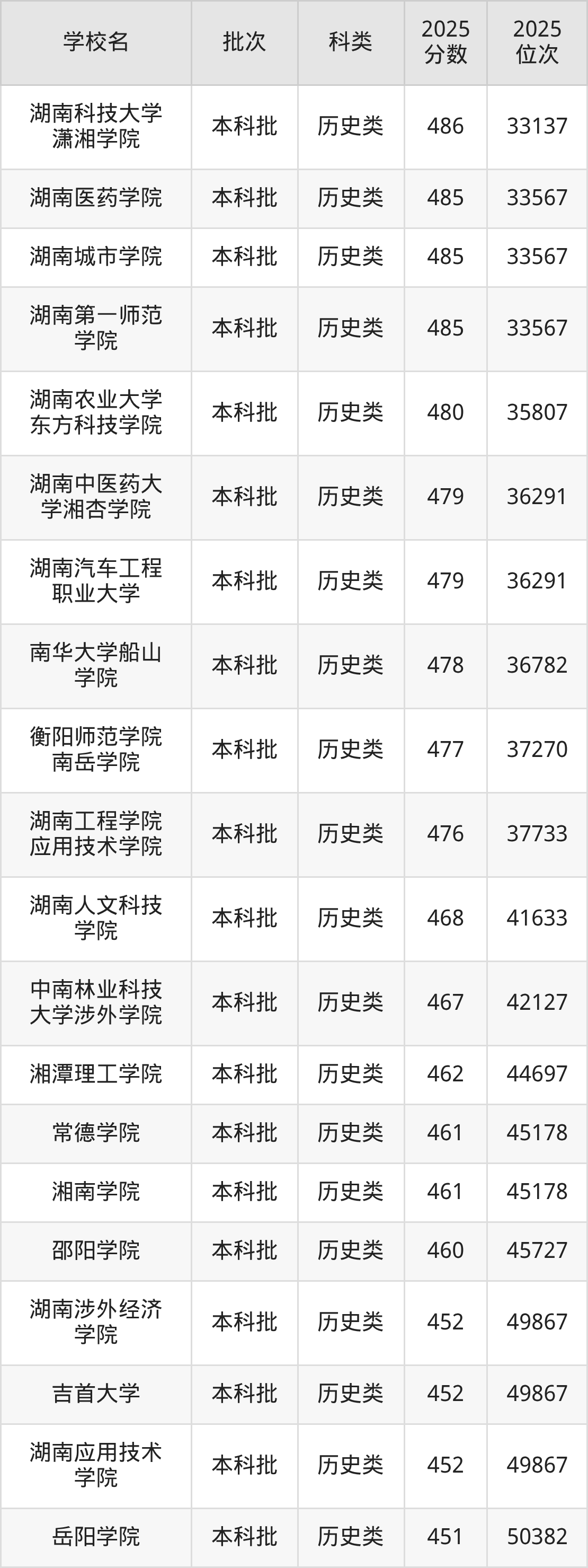 下面是2025年全国二本大学在湖南的最低录取分数线一览表: