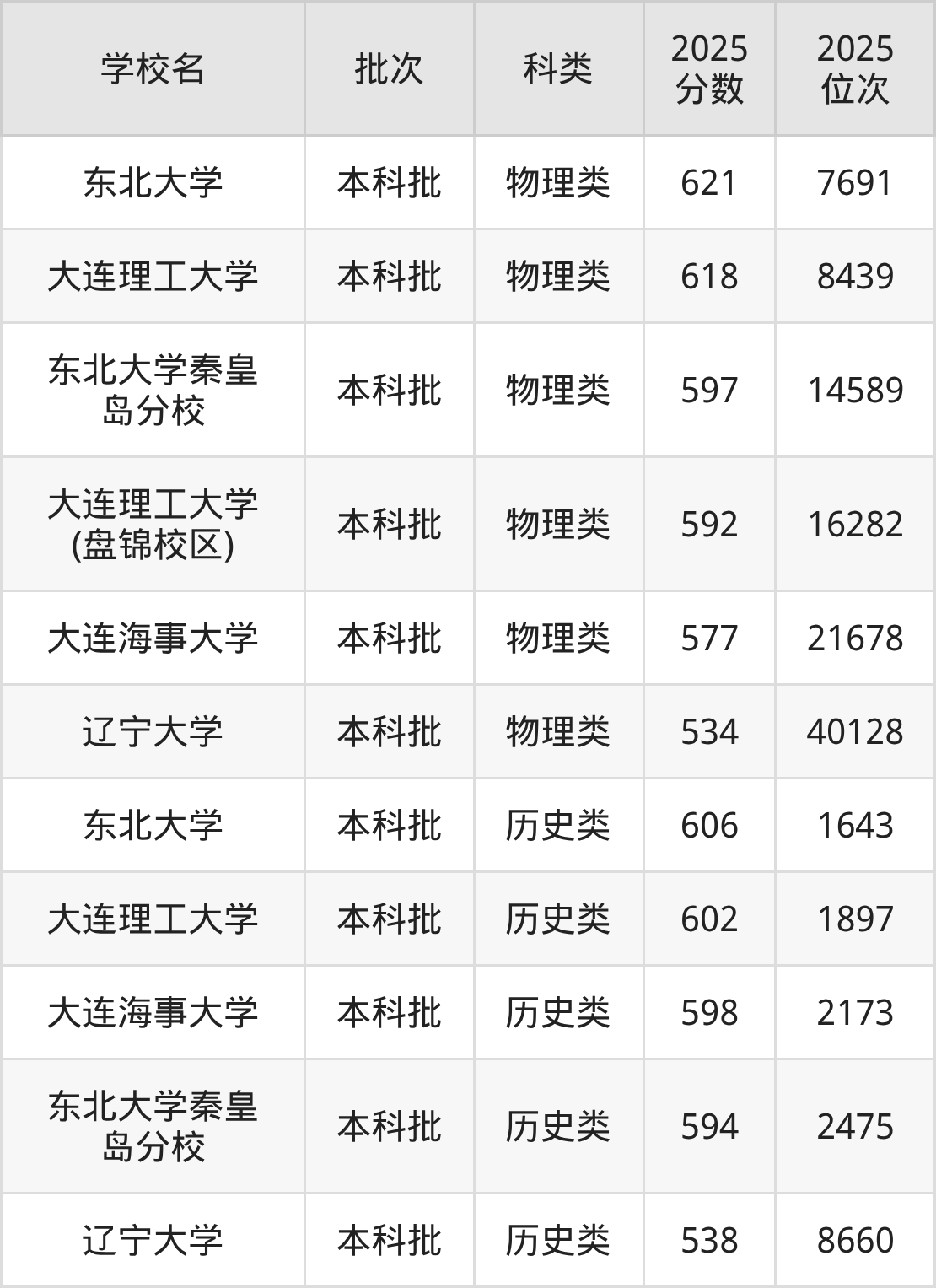 下面是2025年全国双一流大学在辽宁的最低录取分数线一览表: