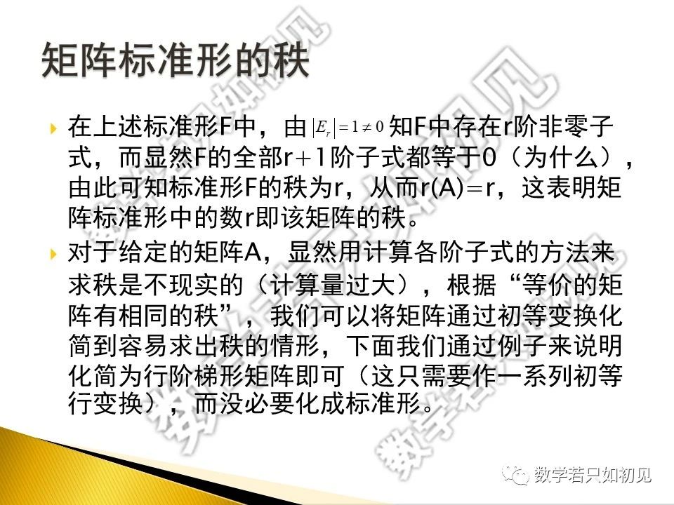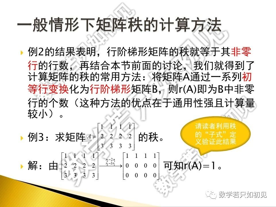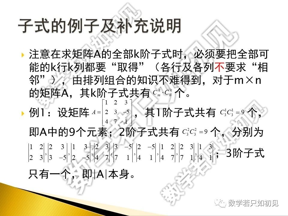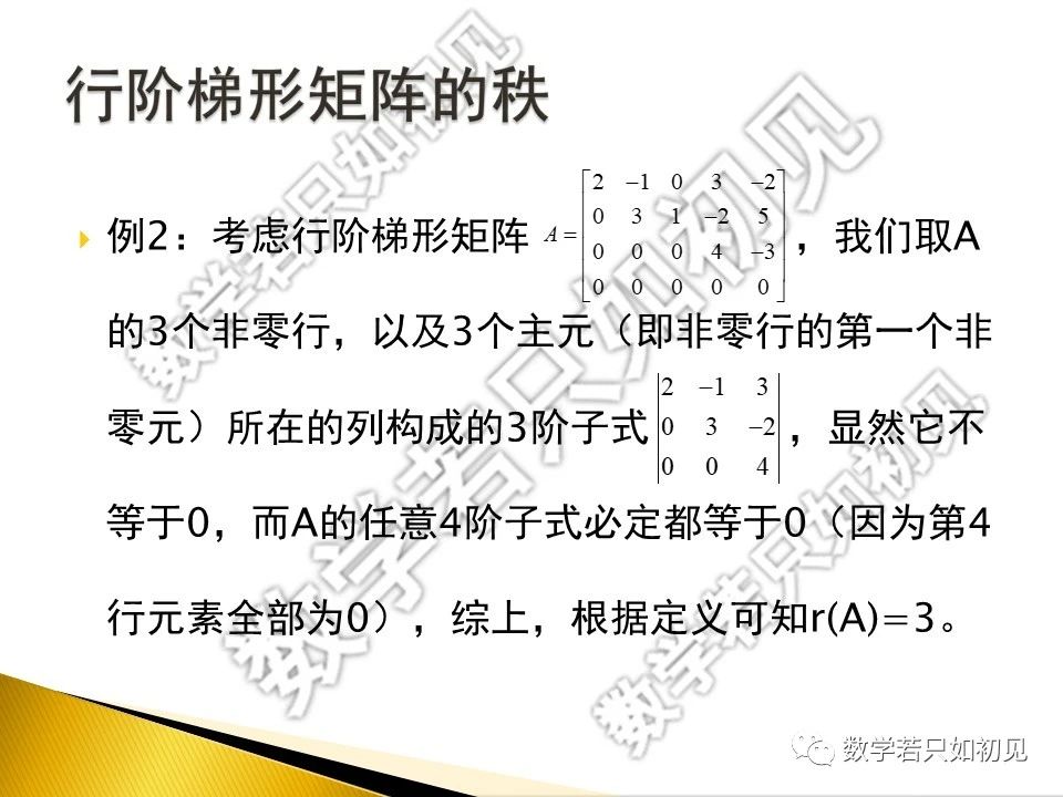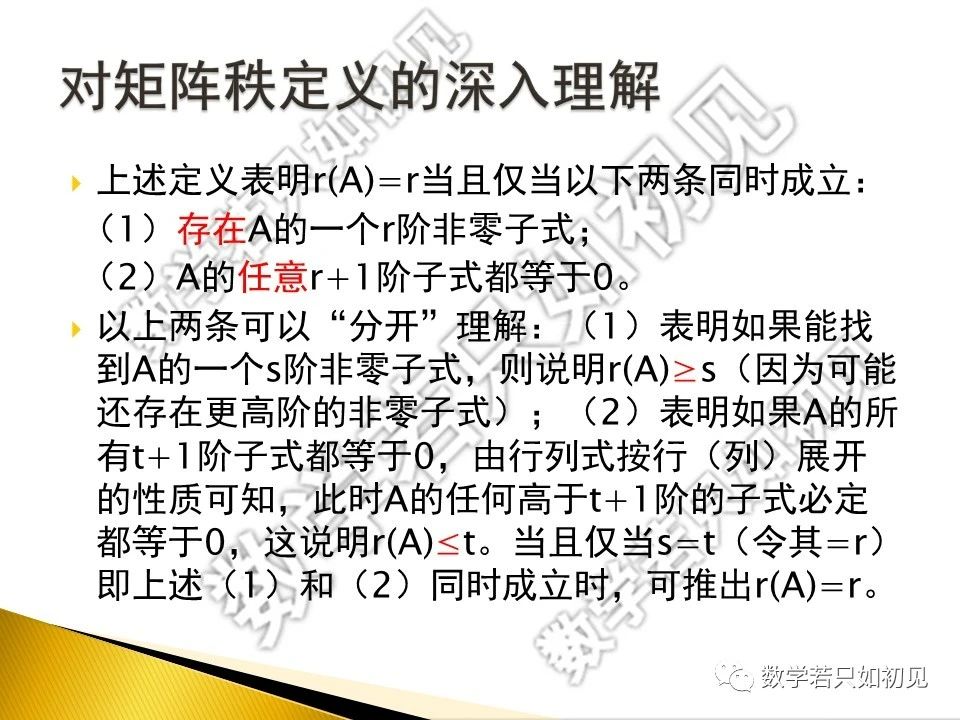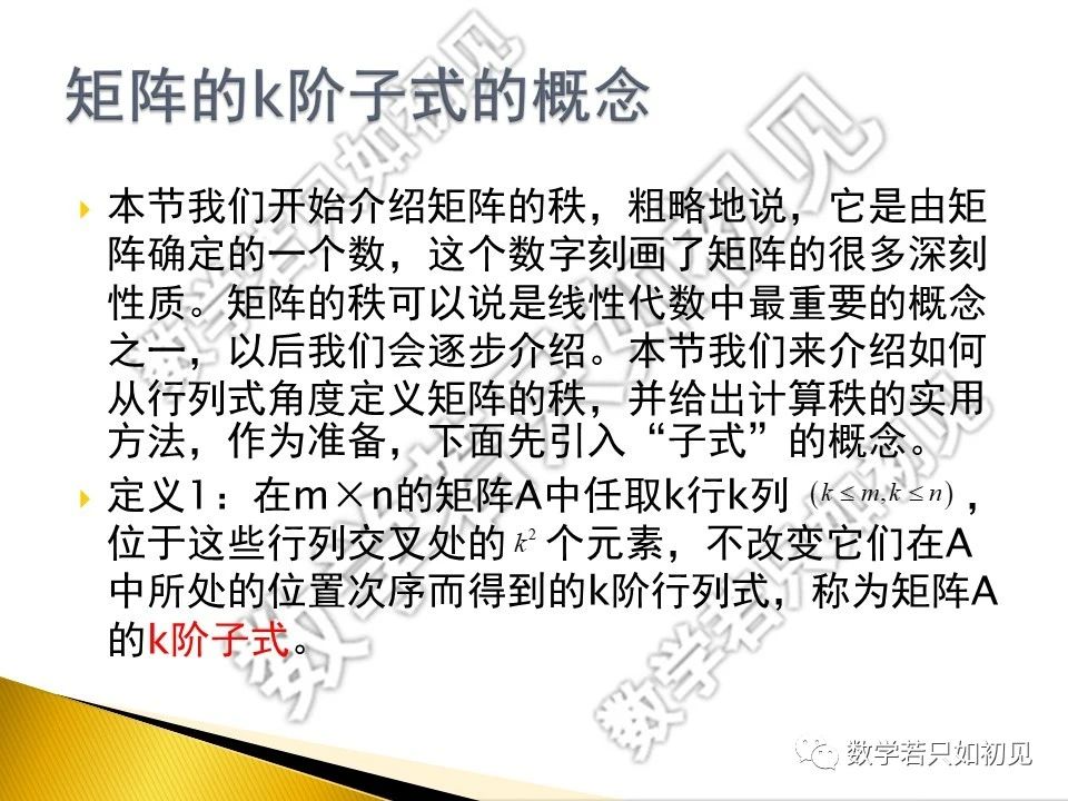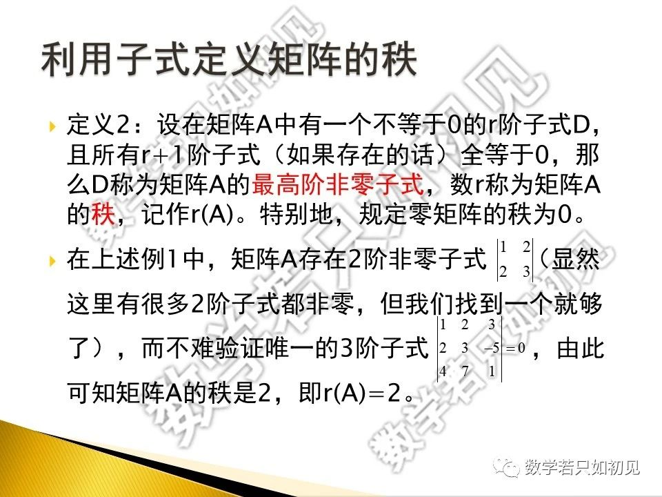 四、对于矩阵秩的定义的深入理解。(对于线性代数课程后续知识有大致了解的读者,通常会把矩阵的秩理解为行阶梯矩阵中非零行的行数,或者向量组的秩等,这些都是正确的,但不要忽视秩的这种“子式”表述。)