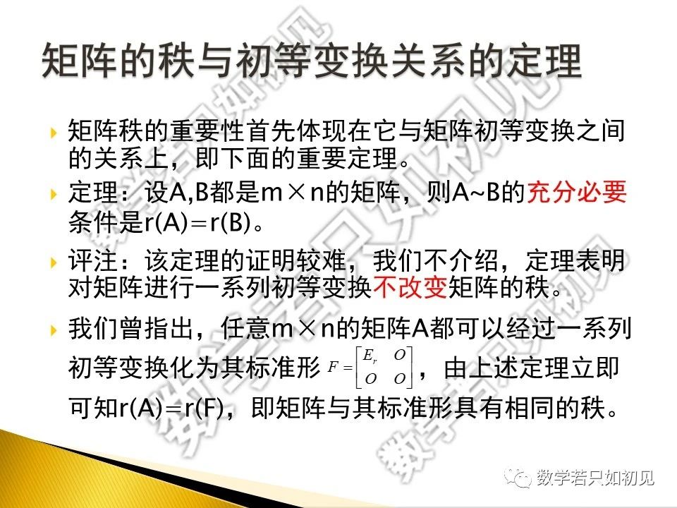 五、矩阵的秩与矩阵初等变换之间关系的重要定理(简单说即初等变换不改变矩阵的秩)。