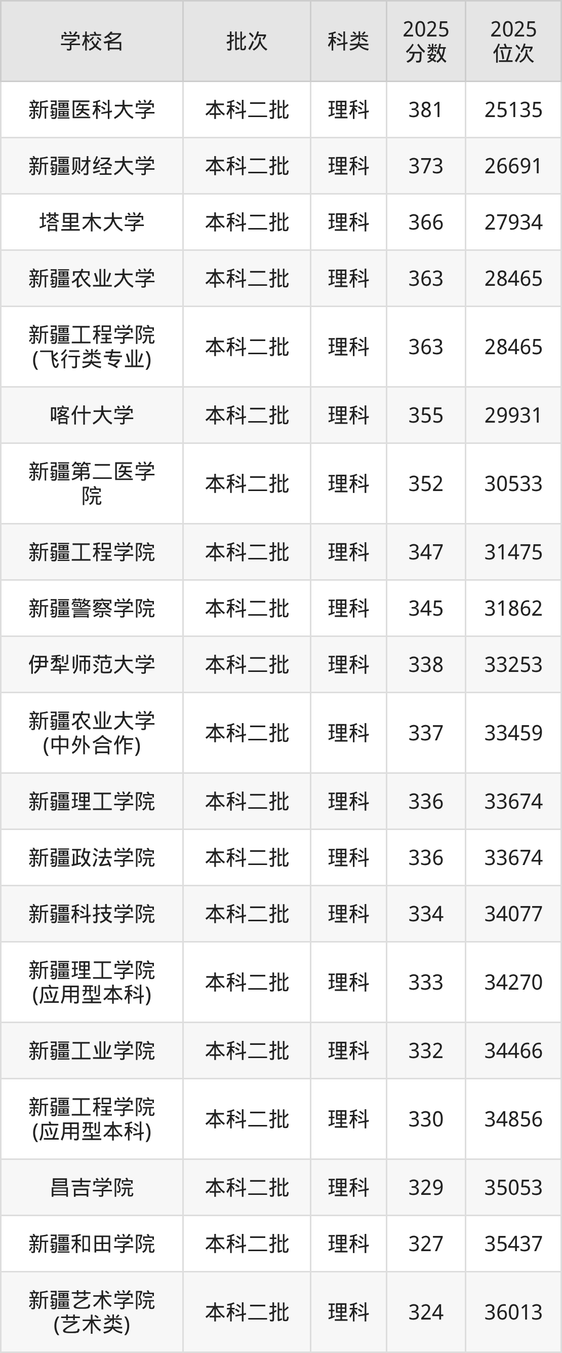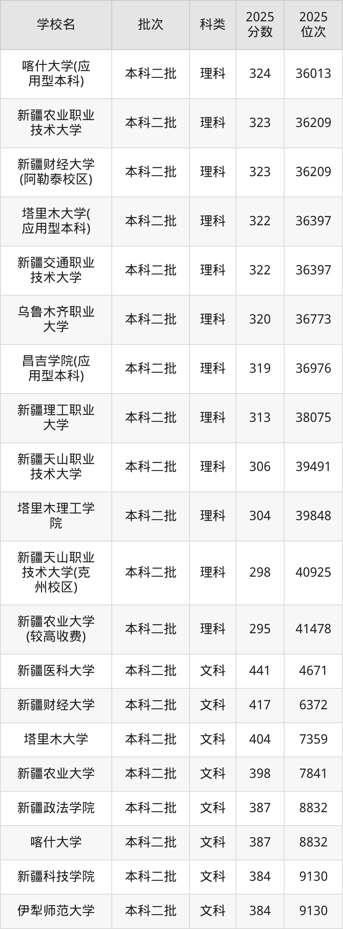 下面是2025年新疆二本大学最低录取分数线一览表: