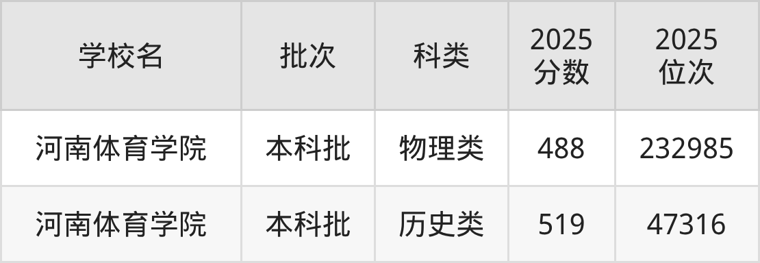 下面是2025年全国体育类大学在河南的最低录取分数线一览表: