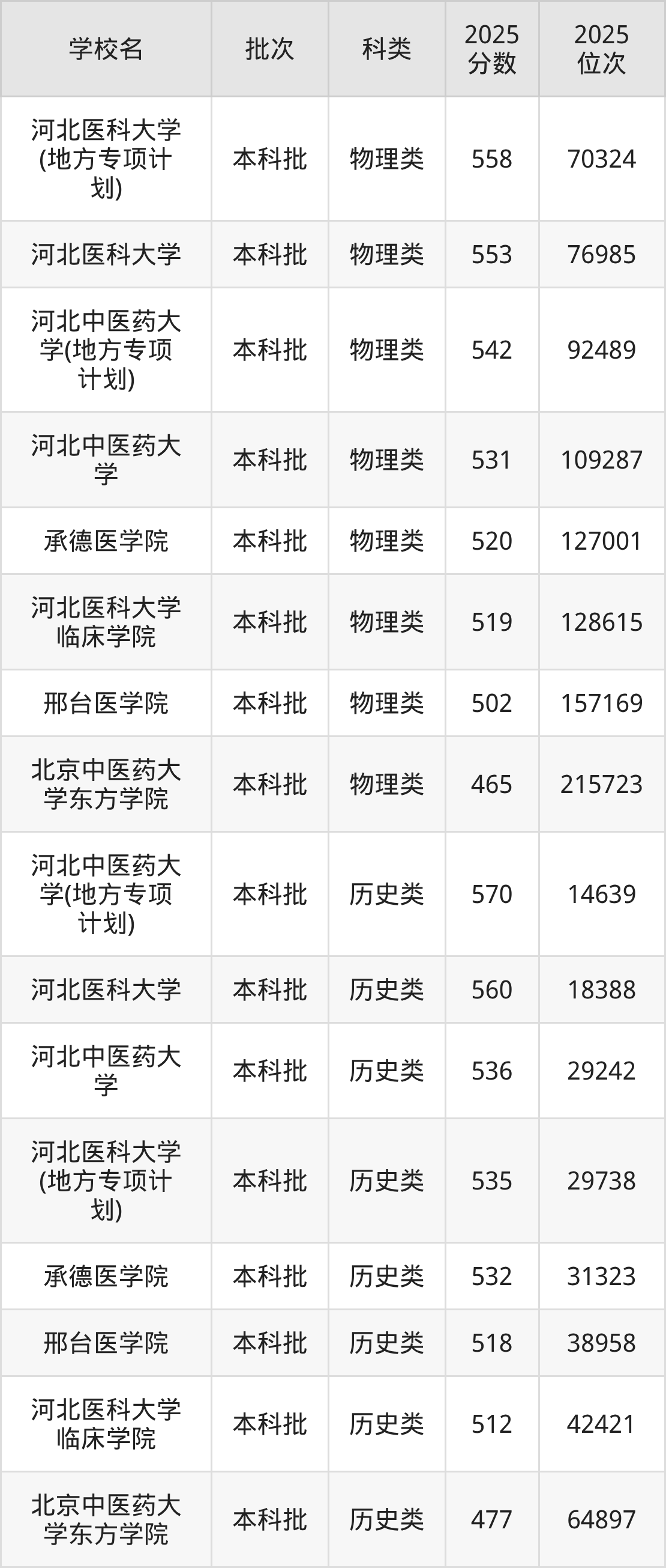 下面是2025年全国医药类大学在河北的最低录取分数线一览表: