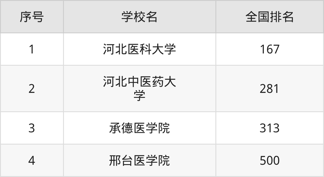 下面是河北省医药类大学最新排名一览表,供参考(下方仅展示本科院校排名):