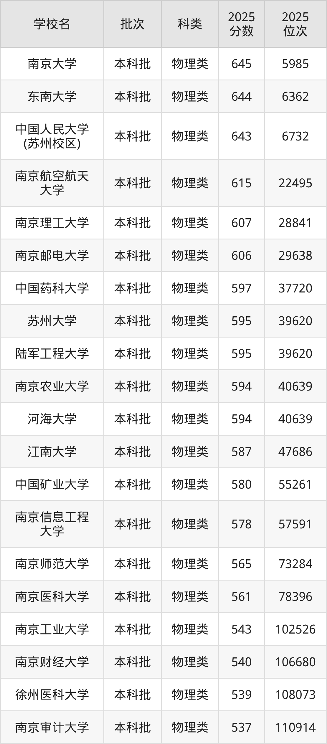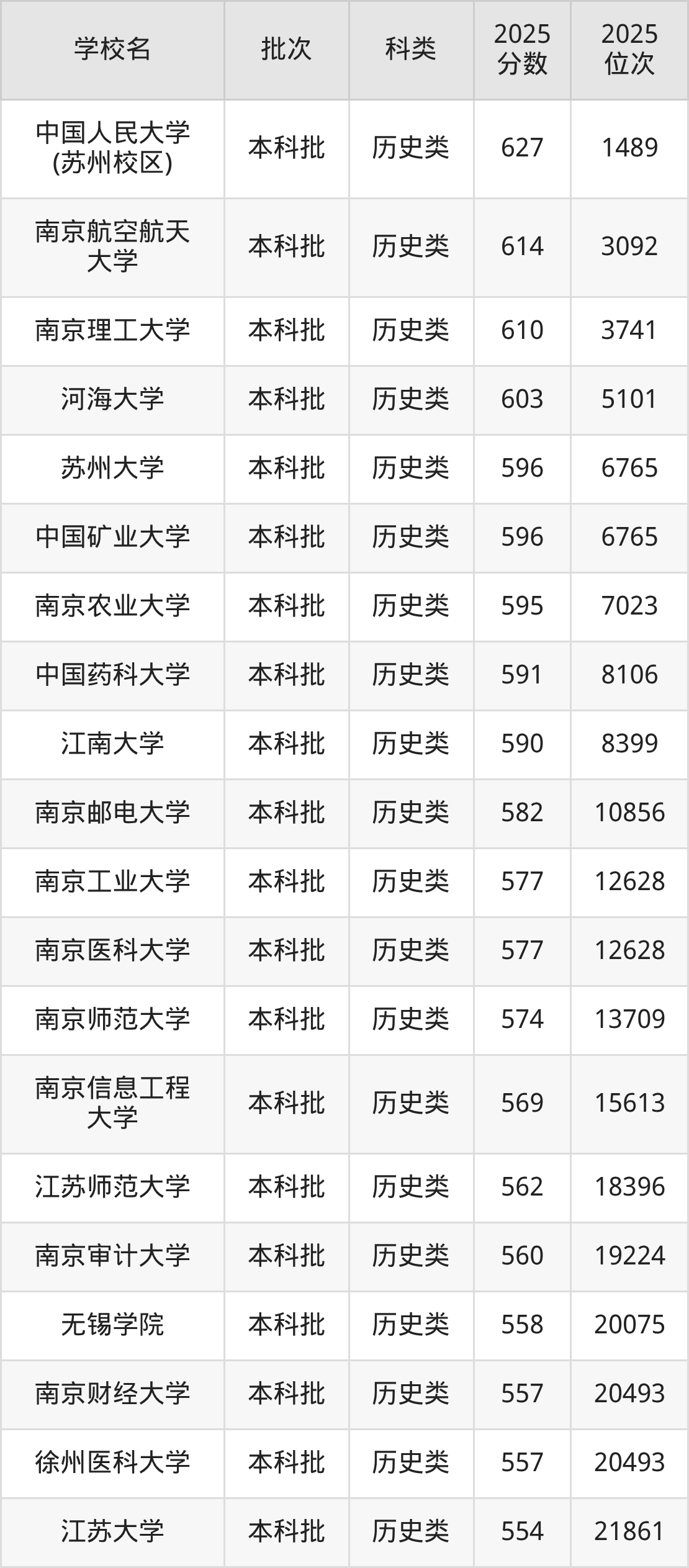 下面是2025年全国一本大学在江苏的最低录取分数线一览表: