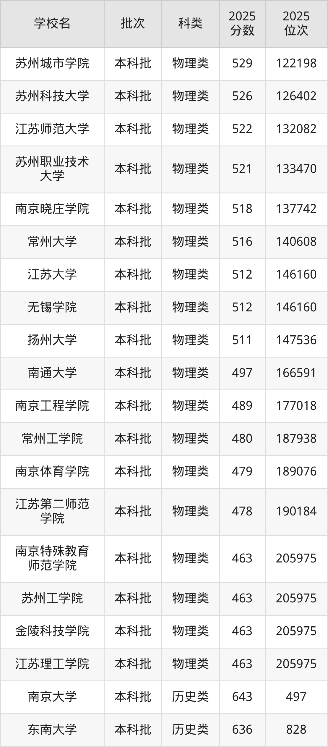根据官方查询到的本科批物理类招录分数来看,2025年全国公办一本大学在江苏的最低录取分数为463分,最低分招生位次205975名。该分数招生的院校为南京特殊教育师范学院、苏州工学院、金陵科技学院,适合低分考生报考。