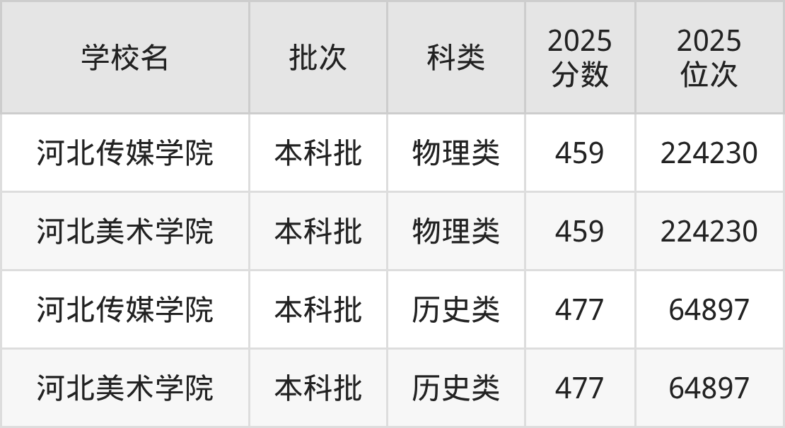 2025年河北物理类民办艺术类大学最低录取分数为459分,最低分招生位次224230名,该分数对应招生院校是河北传媒学院、河北美术学院。