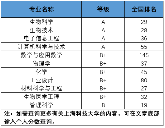另外还有电子信息工程、生物科学、生物技术这三个专业等级也被评为A级,6个专业被评为B+等级,1个专业被评为B级。以下是2023软科专业排名中上海科技大学上榜的专业具体名单,供参考。