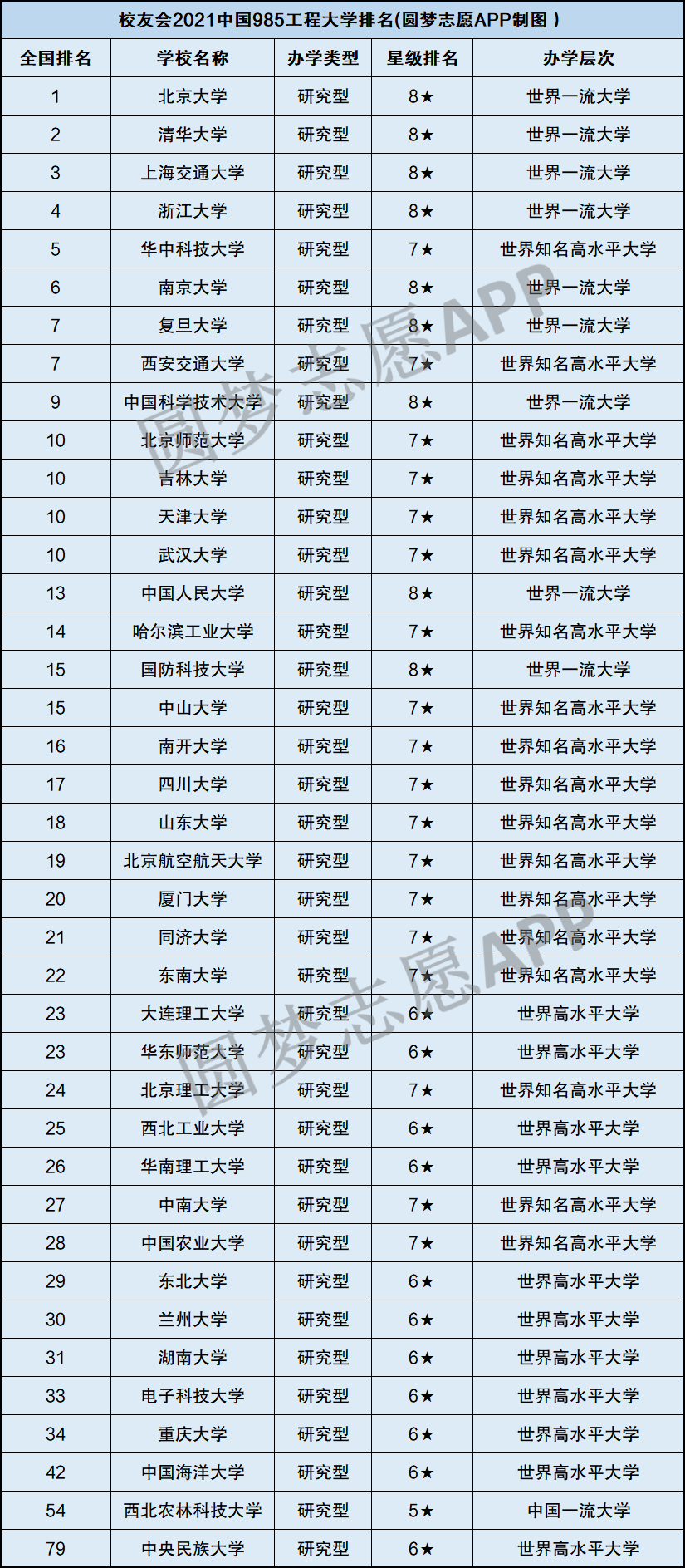 由上可以看出国内排名前十的985大学分别为:北京大学、清华大学、上海交通大学、浙江大学、华中科技大学、南京大学、复旦大学、西安交通大学、中国科学技术大学、北京师范大学、吉林大学、天津大学、武汉大学。其中,北京师范大学、吉林大学、天津大学和武汉大学并列第十,为世界一流大学或世界知名高水平大学。