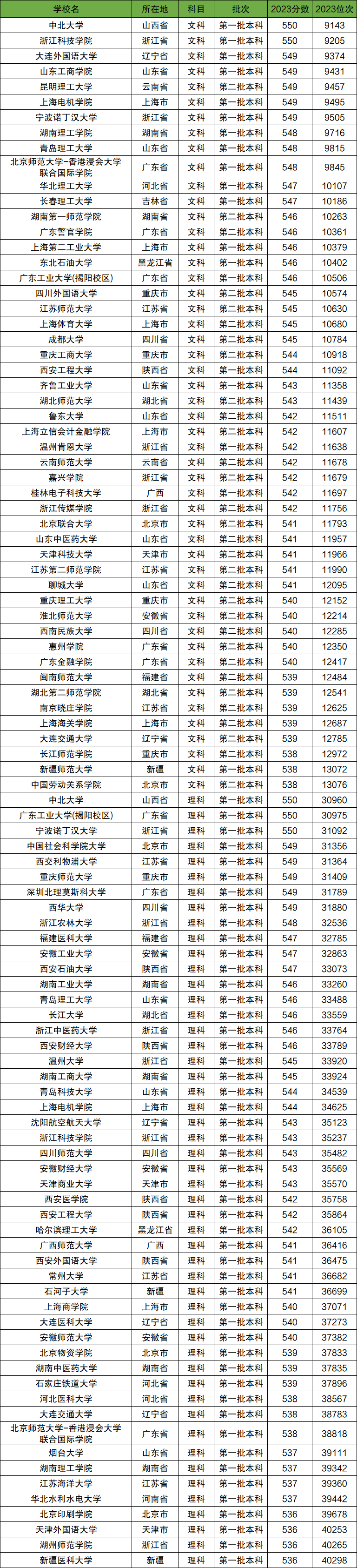 (省内在文科500-550分招生的大学共计26所,本文篇幅有限,只列举10所大学。)