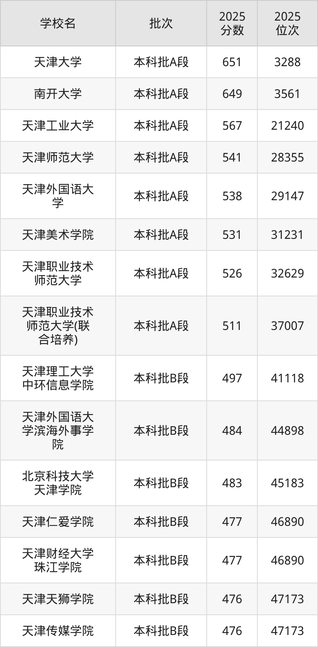 下面是2025年全国文科大学在天津的最低录取分数线一览表: