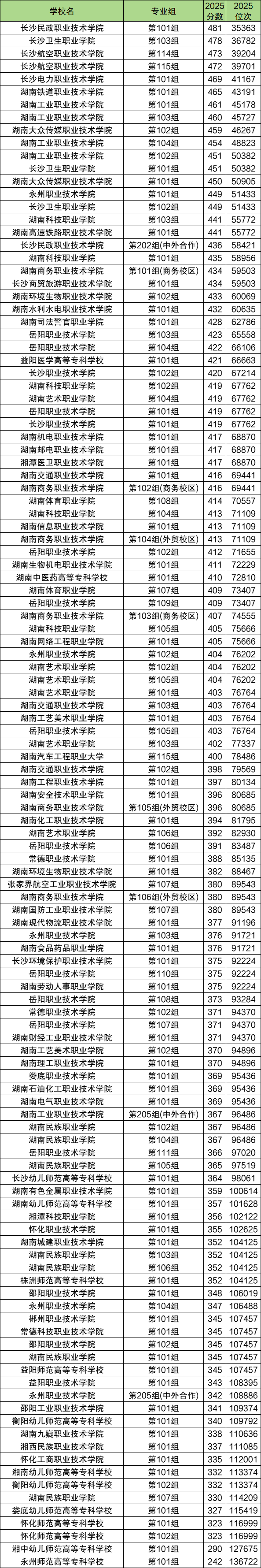 2025年湖南历史类收分最低的公办大专是永州师范高等专科学校第101组,最低分是242分,对应位次是136722名;收分最高的公办大专是长沙民政职业技术学院第101组,最低分是481分,对应位次是35363名;