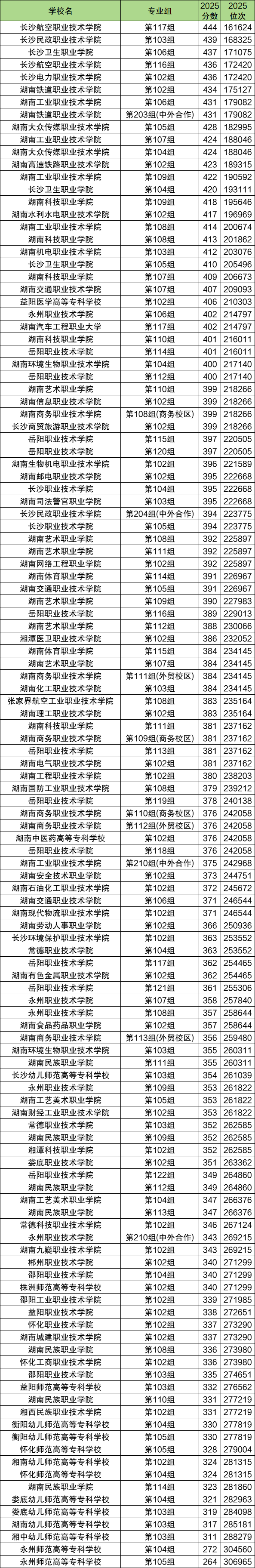 2025年湖南物理类收分最低的公办大专是永州师范高等专科学校第105组,最低分是264分,对应位次是306965名;收分最高的公办大专是长沙航空职业技术学院第117组,最低分是444分,对应位次是161624名。