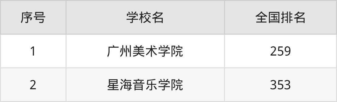 本文以校友会2025年大学全国排名为参考依据,列举广东省内艺术类大学的全国排名情况,其中排名前2的是: