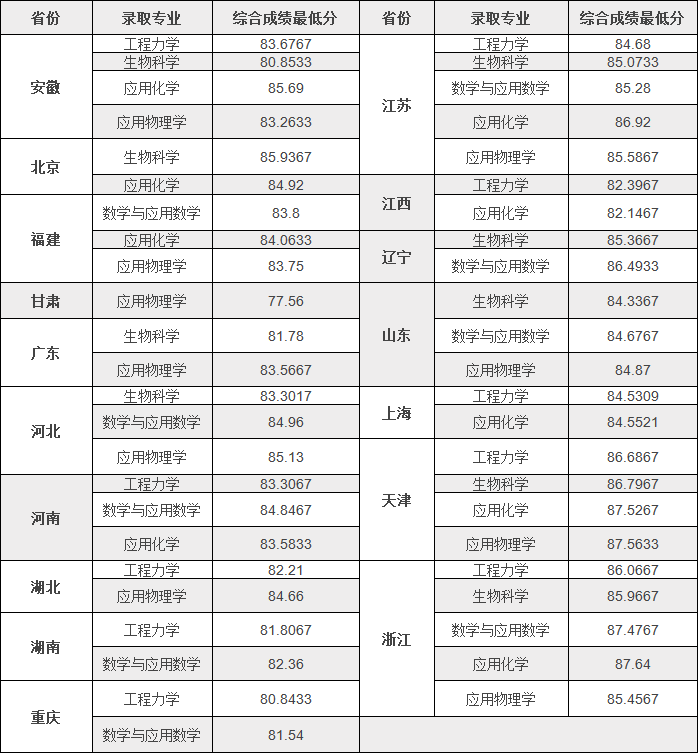 天津大学强基计划各专业在安徽的录取:工程力学83.6767分、生物科学80.8533分、应用化学85.69分。