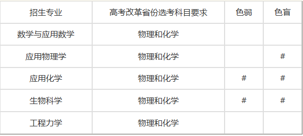 数学与应用数学、应用物理学、应用化学、生物科学、工程力学,以上5个专业对高考改革省份的考生要求选考了物理和化学才可报考。
