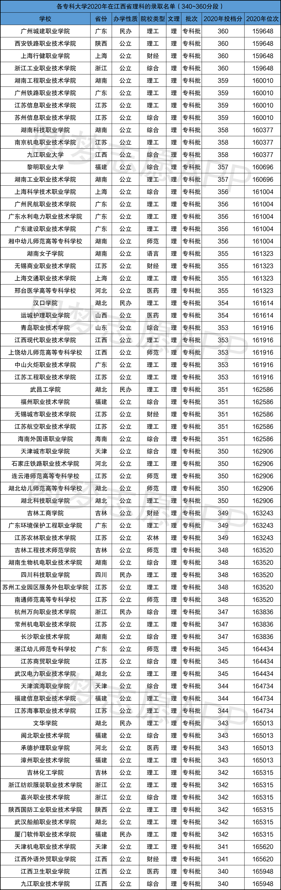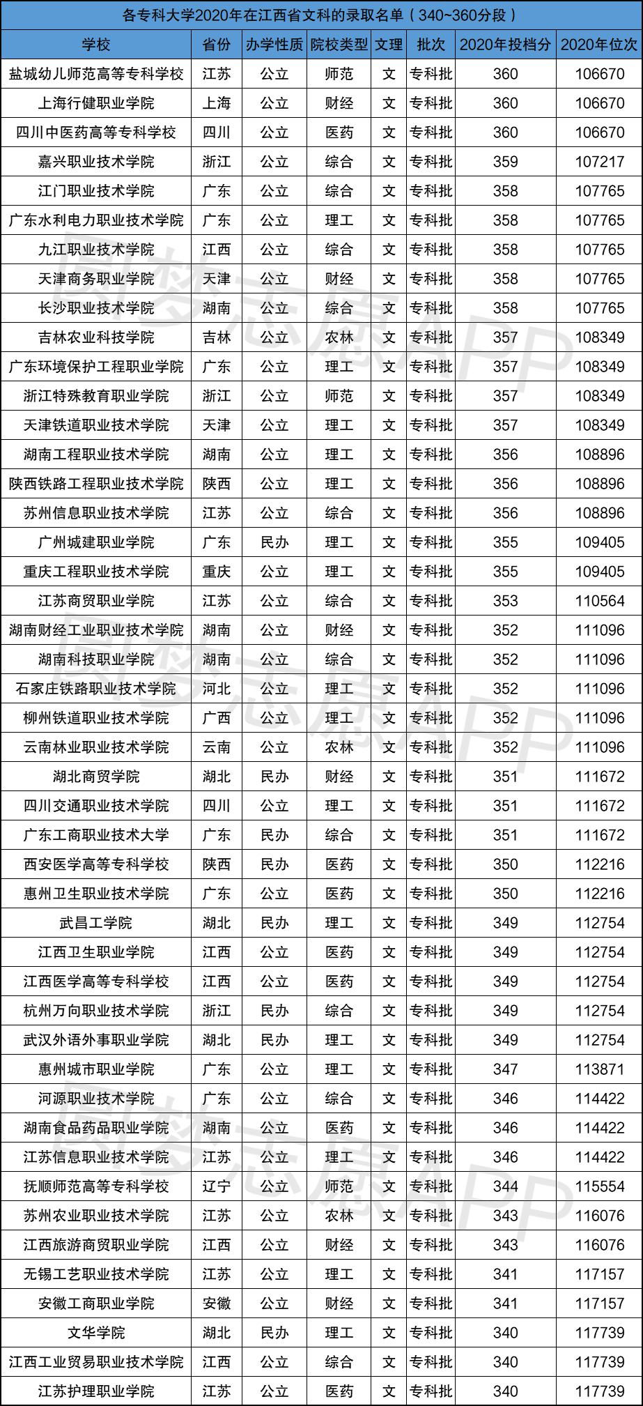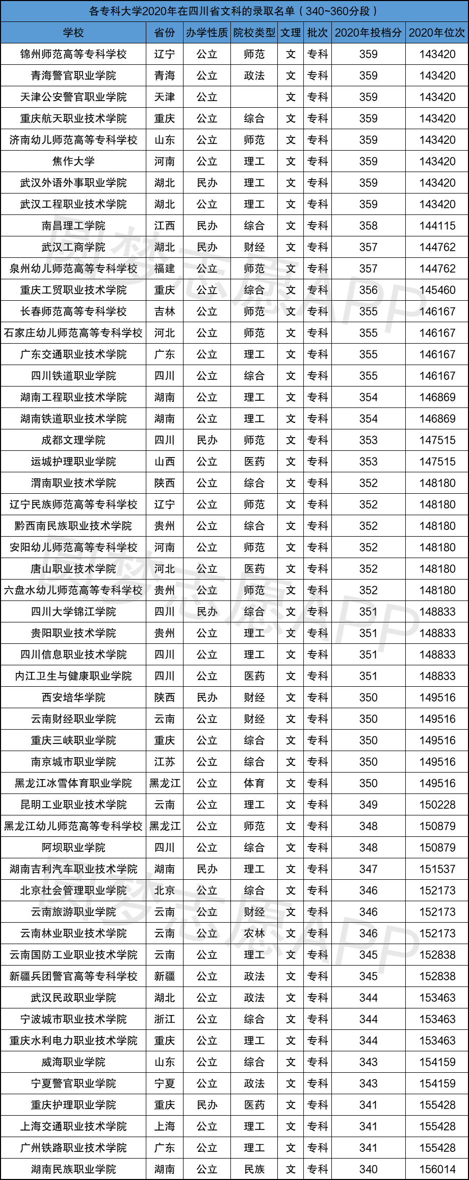 小编根据四川、江西、山东省教育考试院公布的2020年招录数据,为大家整理出了350分左右(340分~360分段)的专科院校名单及录取情况,具体如下: