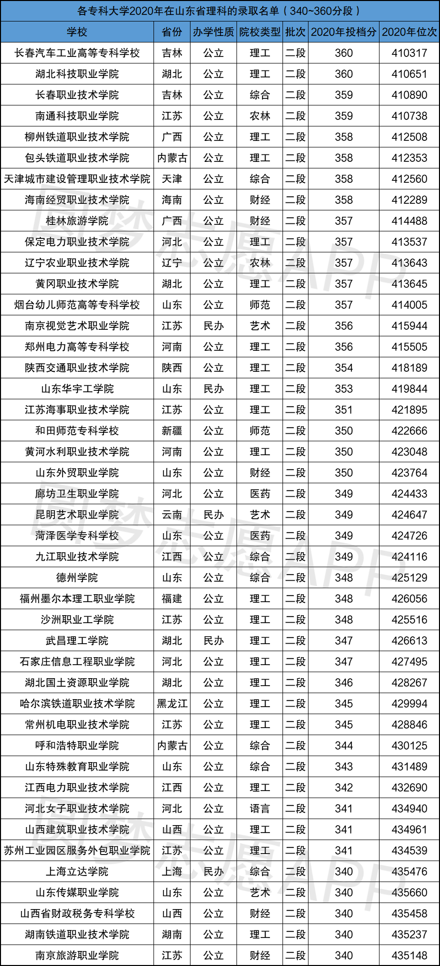 2020年山东省该分段的院校共计有44所,均在二段线进行招生。其中民办院校有5所,公立专科大学有39所;录取分数线最高的为长春汽车工业高等专科学校。具体学校名单如下: