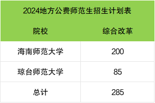 表格数据显示,共计招生285人,其中海南师范大学招生数量最多,为200人;琼台师范大学招生数量最少,为85人。