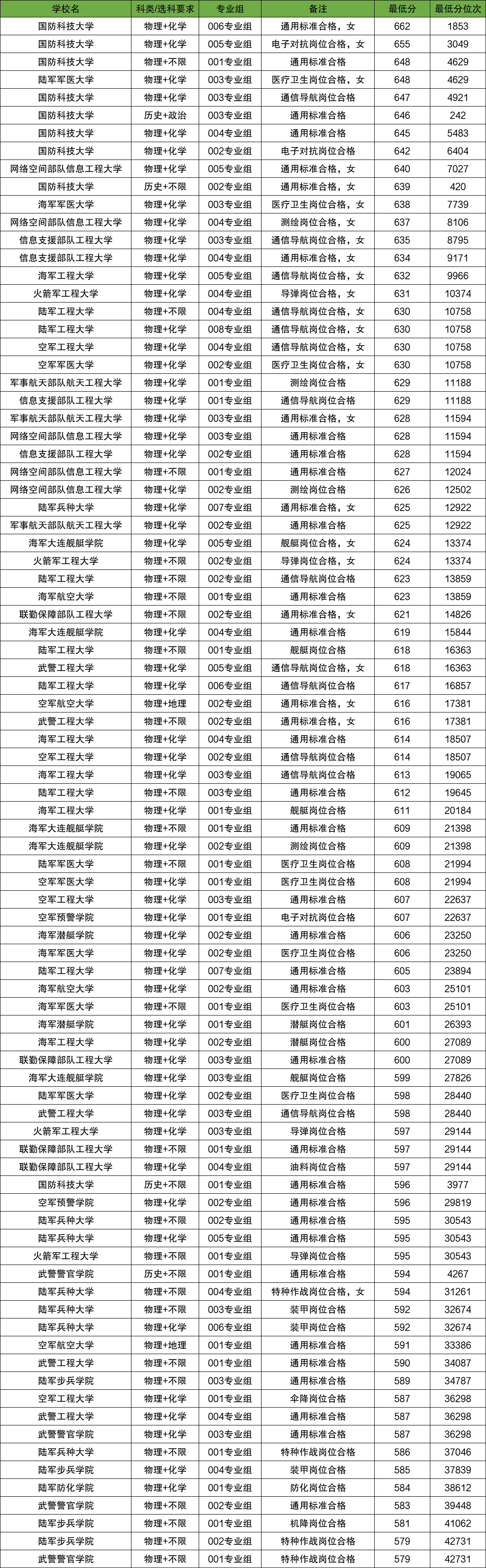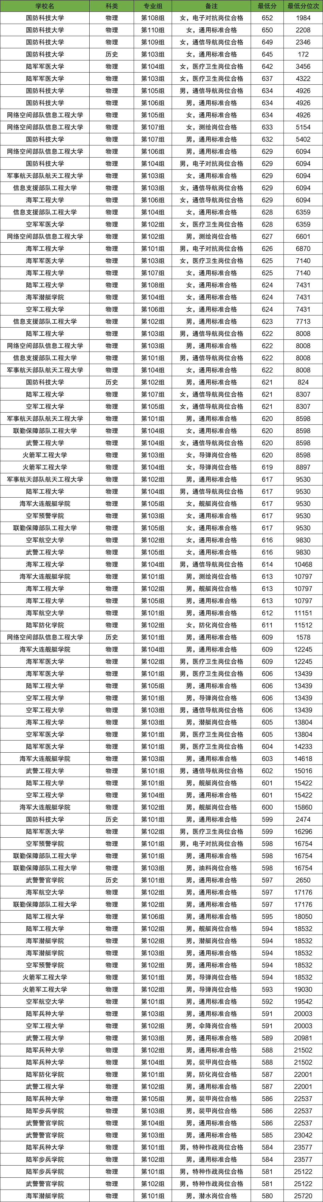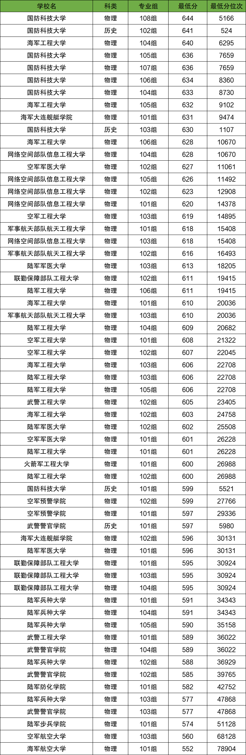 在2025年广东物理类招生中,军校录取分数线较低是海军航空大学101组552分,空军航空大学103组560分,陆军步兵学院101组574分。
