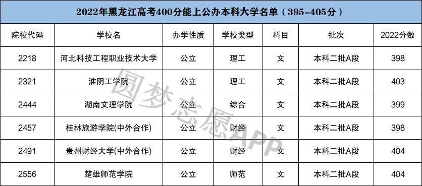 2022年黑龙江文科高考400分左右的本科公办大学有淮阴工学院403分、湖南文理学院399分、楚雄师范学院404分等。