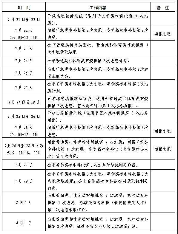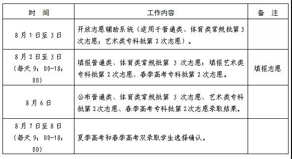 安排3次志愿填报,第1次志愿填报由普通类一段线上考生填报本科志愿,第2次和第3次志愿填报由普通类二段线上考生(含未被录取的一段线上考生)填报本、专科志愿。