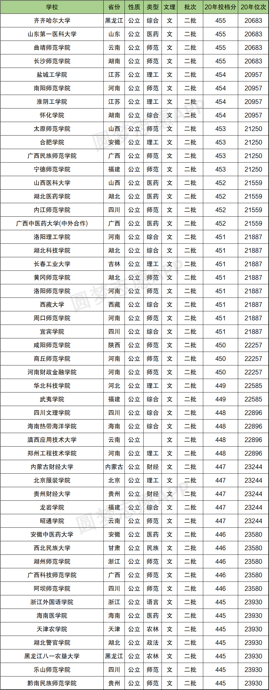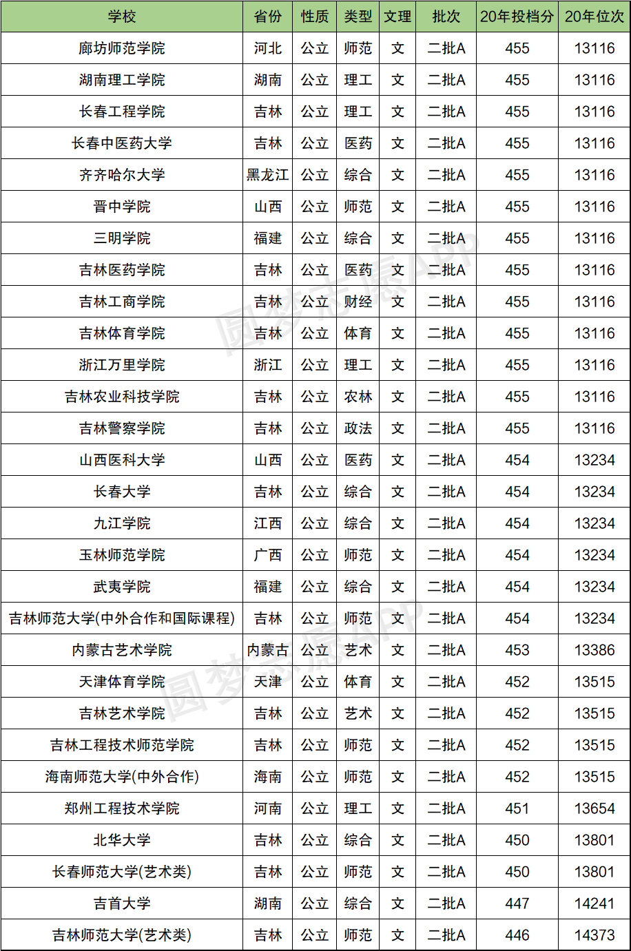 本文以吉林、广西为例,根据省教育考试院公布的2020年招录数据,将在两个省份本科二批文科投档情况,从高到底的分数进行排序,选择分值在445分~455分之间的院校,以下为具体名单:
