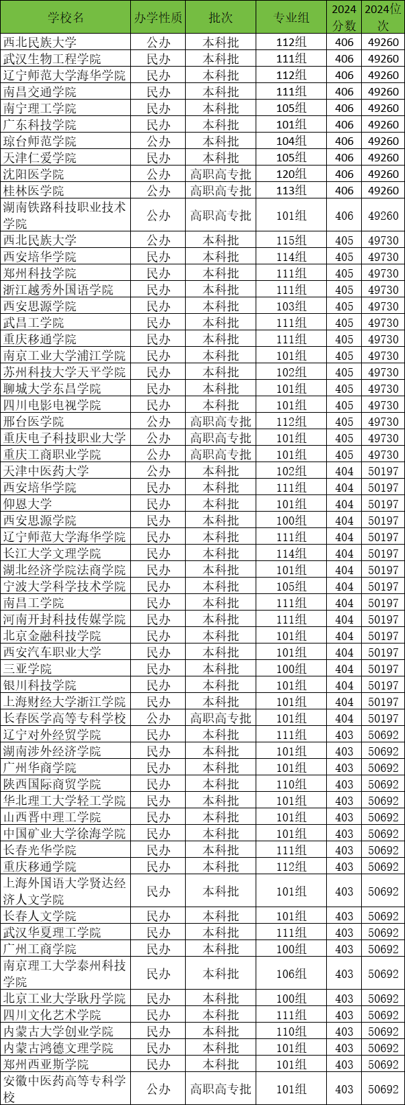 广西历史类成绩排名5万能上的院校专业组具体位次为:49260名-50692名,共有61个,对应分数为406分-403分。