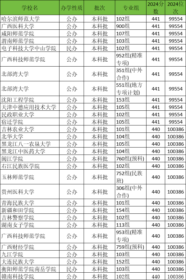 广西物理类成绩排名10万能上的院校专业组具体位次为:99554名-100386名,共有30个,对应分数为441分-440分。