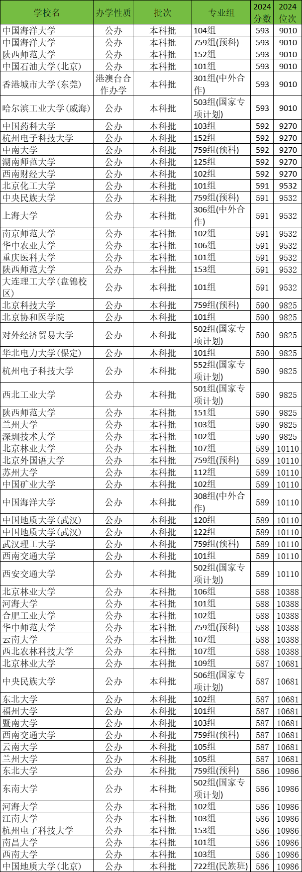 位次1万名左右的考生能上的院校专业组有:中国海洋大学104组(9010名)、中国药科大学103组(9270名)、北京化工大学101组(9532名)、北京协和医学院101组(9825名)、北京林业大学107组(10110名)、河海大学101组(10388名)等。