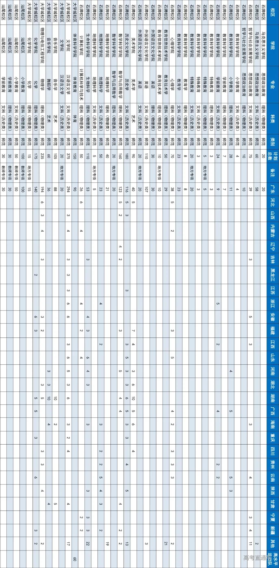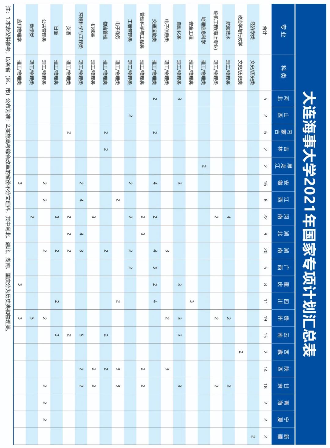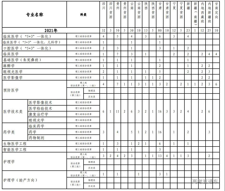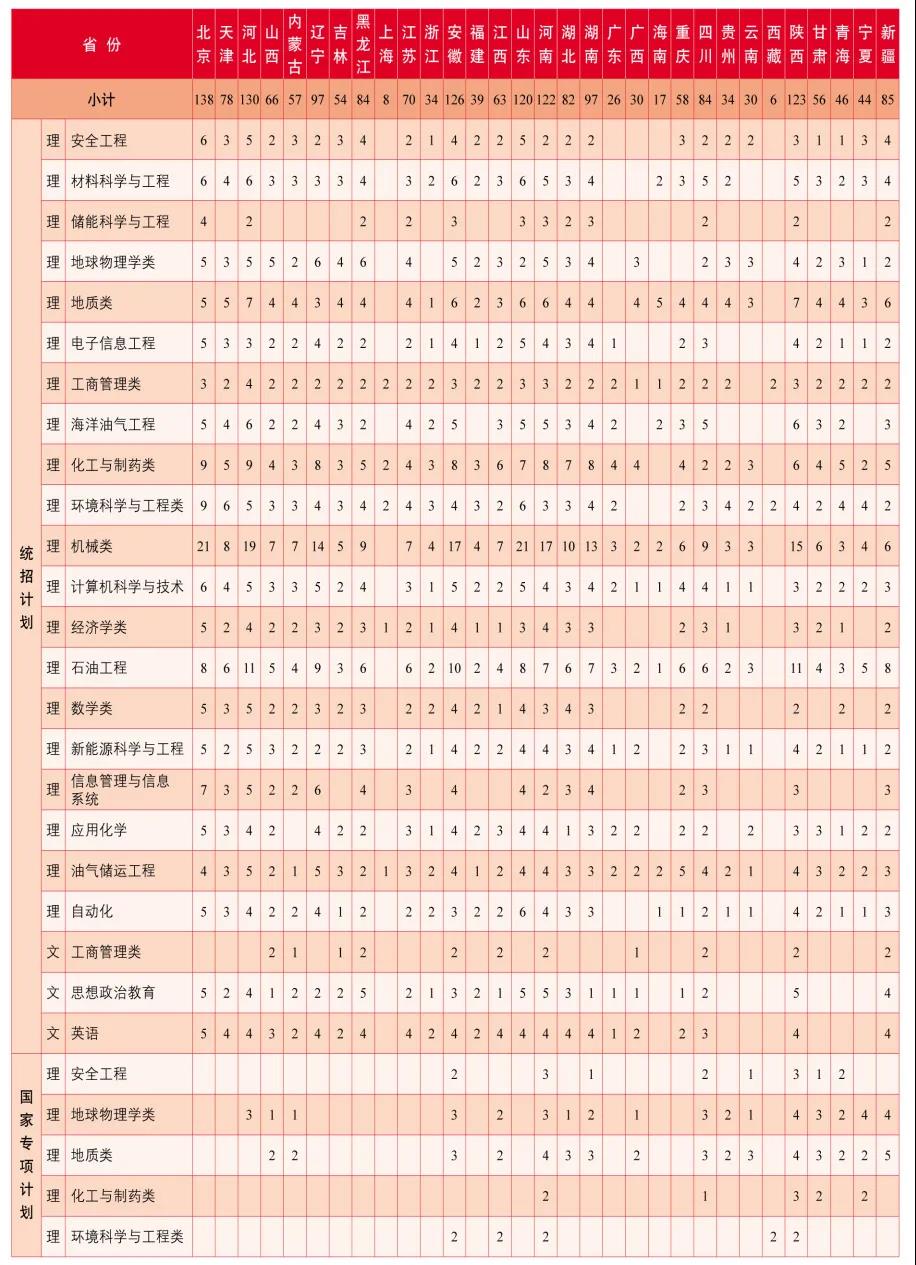 注:新疆“国家专项计划”含5个南疆计划,专业为地质类 ;高考综合改革省份不分文理;此表仅供参考,以教育部最终公布的计划数为准。